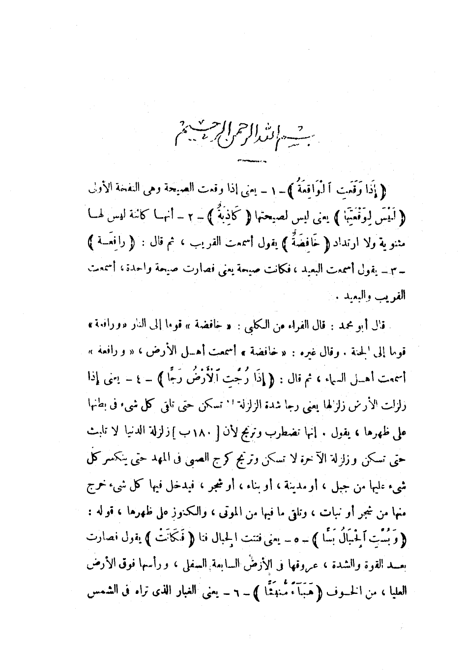 بِسْمِ اللَّهِ الرَّحْمنِ الرَّحِيمِ إِذا وَقَعَتِ الْواقِعَةُ- 1- يعني إذا وقعت الصيحة وهي النفخة الأولى لَيْسَ لِوَقْعَتِها يعنى ليس لصيحتها كاذِبَةٌ- 2- أنها كائنة ليس لها مثنوية ولا ارتداد خافِضَةٌ يقول أسمعت القريب، ثم قال: رافِعَةٌ- 3- يقول أسمعت البعيد، فكانت صيحة يعني فصارت صيحة واحدة، أسمعت القريب والبعيد.