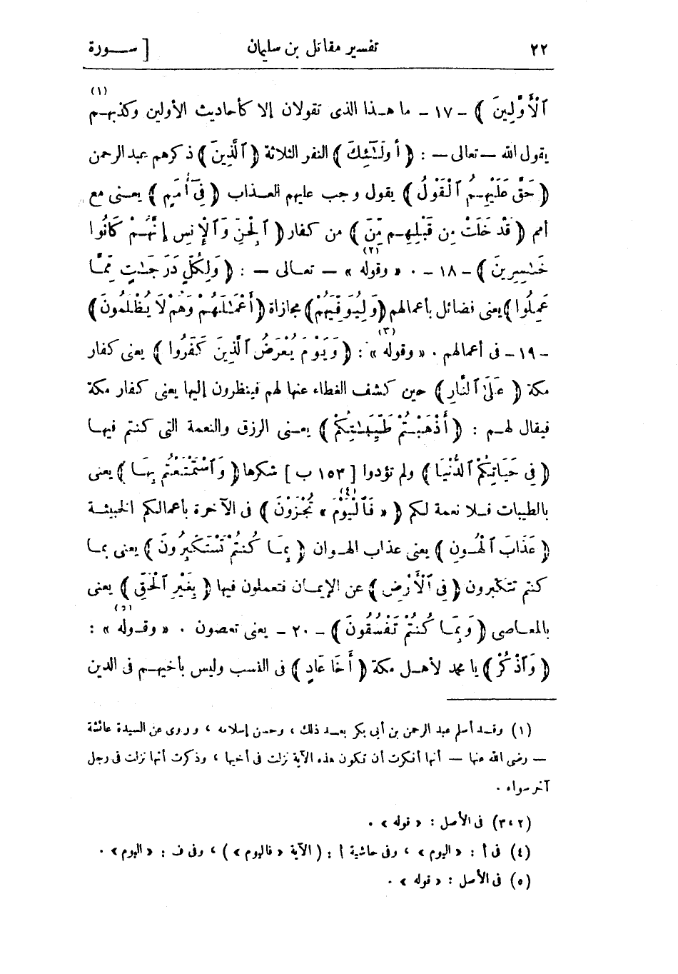 ما هذا إِلَّا أَساطِيرُ الْأَوَّلِينَ- 17- ما هذا الذي تقولان إلا كأحاديث الأولين وكذبهم «1» يقول الله- تعالى-: أُولئِكَ النفر الثلاثة الَّذِينَ ذكرهم عبد الرحمن حَقَّ عَلَيْهِمُ الْقَوْلُ يقول وجب عليهم العذاب فِي أُمَمٍ يعني مع أمم قَدْ خَلَتْ مِنْ قَبْلِهِمْ مِنَ من كفار الْجِنِّ وَالْإِنْسِ إِنَّهُمْ كانُوا خاسِرِينَ- 18-. «وقوله» «2» - تعالى-: وَلِكُلٍّ دَرَجاتٌ مِمَّا عَمِلُوا يعنى فضائل بأعمالهم وَلِيُوَفِّيَهُمْ مجازاة أَعْمالَهُمْ وَهُمْ لا يُظْلَمُونَ- 19- فى أعمالهم. «وقوله» «3» : وَيَوْمَ يُعْرَضُ الَّذِينَ كَفَرُوا يعني كفار مكة عَلَى النَّارِ حين كشف الغطاء عنها لهم فينظرون إليها يعني كفار مكة فيقال لهم: أَذْهَبْتُمْ طَيِّباتِكُمْ يعني الرزق والنعمة التي كنتم فيها فِي حَياتِكُمُ الدُّنْيا ولم تؤدوا [153 ب] شكرها وَاسْتَمْتَعْتُمْ بِها