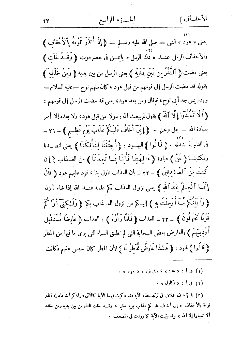 (3) فى أ، ف خلاف فى ترتيب هذه الآية فقد ذكرت فيهما الآية كالآتى وَاذْكُرْ أَخا عادٍ إِذْ أَنْذَرَ قَوْمَهُ بِالْأَحْقافِ «إِنِّي أَخافُ عَلَيْكُمْ عَذابَ يَوْمٍ عَظِيمٍ» ، وَقَدْ خَلَتِ النُّذُرُ مِنْ بَيْنِ يَدَيْهِ وَمِنْ خَلْفِهِ أَلَّا تَعْبُدُوا إِلَّا اللَّهَ وقد رتبت الآية كما وردت فى المصحف.
