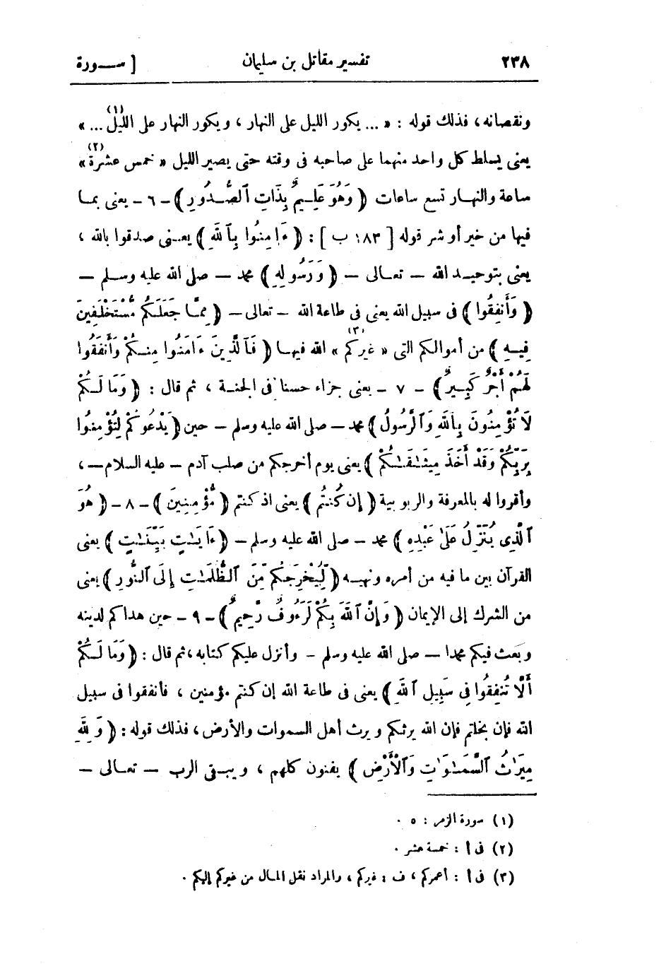 يعني يسلط كل واحد منهما على صاحبه في وقته حتى يصير الليل «خمس عشرة «2» » ساعة والنهار تسع ساعات وَهُوَ عَلِيمٌ بِذاتِ الصُّدُورِ- 6- يعني بما فيها من خير أو شر قوله [183 ب] : آمِنُوا بِاللَّهِ يعني صدقوا بالله، يعني بتوحيد الله- تعالى- وَرَسُولِهِ محمد- صلى الله عليه وسلم- وَأَنْفِقُوا في سبيل الله يعني في طاعة الله- تعالى- مِمَّا جَعَلَكُمْ مُسْتَخْلَفِينَ فِيهِ من أموالكم التي «غيركم «3» » الله فيها فَالَّذِينَ آمَنُوا مِنْكُمْ وَأَنْفَقُوا لَهُمْ أَجْرٌ كَبِيرٌ- 7- يعني جزاء حسنا في الجنة، ثم قال: وَما لَكُمْ لا تُؤْمِنُونَ بِاللَّهِ وَالرَّسُولُ محمد- صلى الله عليه وسلم- حين يَدْعُوكُمْ لِتُؤْمِنُوا بِرَبِّكُمْ وَقَدْ أَخَذَ مِيثاقَكُمْ يعني يوم أخرجكم من صلب آدم- عليه السلام-، وأقروا له بالمعرفة والربوبية إِنْ كُنْتُمْ يعني إذ كنتم مُؤْمِنِينَ- 8- هُوَ الَّذِي يُنَزِّلُ عَلى عَبْدِهِ محمد- صلى الله عليه وسلم- آياتٍ بَيِّناتٍ يعني القرآن بين ما فيه من أمره ونهيه لِيُخْرِجَكُمْ مِنَ الظُّلُماتِ إِلَى النُّورِ يعني من الشرك إلى الإيمان وَإِنَّ اللَّهَ بِكُمْ لَرَؤُفٌ رَحِيمٌ- 9- حين هداكم لدينه وبعث فيكم محمدا- صلى الله عليه وسلم- وأنزل عليكم كتابه، ثم قال: وَما لَكُمْ أَلَّا تُنْفِقُوا فِي سَبِيلِ اللَّهِ يعني في طاعة الله إن كنتم مؤمنين، فأنفقوا في سبيل الله فإن بخلتم فإن الله يرثكم ويرث أهل السموات والأرض، فذلك قوله: وَلِلَّهِ مِيراثُ السَّماواتِ وَالْأَرْضِ