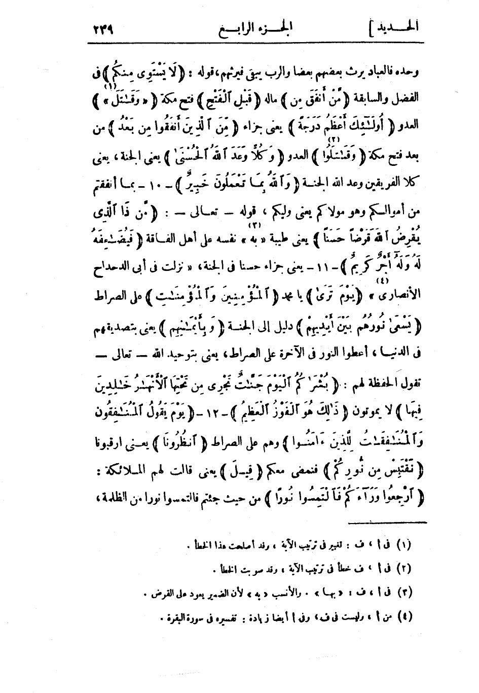وحده فالعباد يرث بعضهم بعضا والرب يبقى فيرثهم، قوله: لا يَسْتَوِي مِنْكُمْ فى الفضل والسابقة مَنْ أَنْفَقَ مِنْ ماله قَبْلِ الْفَتْحِ فتح مكة «وَقاتَلَ» «1» العدو أُولئِكَ أَعْظَمُ دَرَجَةً يعني جزاء مِنَ الَّذِينَ أَنْفَقُوا مِنْ بَعْدُ من بعد فتح مكة وَقاتَلُوا «2» العدو وَكُلًّا وَعَدَ اللَّهُ الْحُسْنى يعني الجنة، يعني كلا الفريقين وعد الله الجنة وَاللَّهُ بِما تَعْمَلُونَ خَبِيرٌ- 10- بما أنفقتم من أموالكم وهو مولاكم يعني وليكم، قوله- تعالى-: مَنْ ذَا الَّذِي يُقْرِضُ اللَّهَ قَرْضاً حَسَناً يعني طيبة «به «3» » نفسه على أهل الفاقة فَيُضاعِفَهُ لَهُ وَلَهُ أَجْرٌ كَرِيمٌ- 11- يعني جزاء حسنا في الجنة، «نزلت في أبي الدحداح الأنصاري» «4» يَوْمَ تَرَى يا محمد الْمُؤْمِنِينَ وَالْمُؤْمِناتِ على الصراط يَسْعى نُورُهُمْ بَيْنَ أَيْدِيهِمْ دليل إلى الجنة وَبِأَيْمانِهِمْ يعني بتصديقهم في الدنيا، أعطوا النور في الآخرة على الصراط، يعني بتوحيد الله- تعالى- تقول الحفظة لهم: بُشْراكُمُ الْيَوْمَ جَنَّاتٌ تَجْرِي مِنْ تَحْتِهَا الْأَنْهارُ خالِدِينَ فِيها لا يموتون ذلِكَ هُوَ الْفَوْزُ الْعَظِيمُ- 12- يَوْمَ يَقُولُ الْمُنافِقُونَ وَالْمُنافِقاتُ لِلَّذِينَ آمَنُوا وهم على الصراط انْظُرُونا يعني ارقبونا نَقْتَبِسْ مِنْ نُورِكُمْ فنمضى معكم قِيلَ يعني قالت لهم الملائكة: