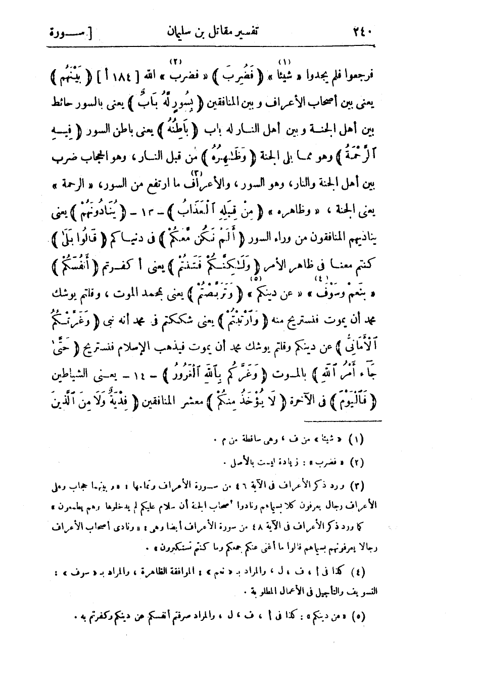 فرجعوا فلم يجدوا «شيئا» «1» فَضُرِبَ «فضرب» «2» الله [184 أ] بَيْنَهُمْ يعني بين أصحاب الأعراف وبين المنافقين بِسُورٍ لَهُ بابٌ يعني بالسور حائط بين أهل الجنة وبين أهل النار له باب باطِنُهُ يعني باطن السور فِيهِ الرَّحْمَةُ وهو مما بلى الجنة وَظاهِرُهُ من قبل النار، وهو الحجاب ضرب بين أهل الجنة والنار، وهو السور، والأعراف «3» ما ارتفع من السور، «الرَّحْمَةُ» يعني الجنة، «وظاهره» مِنْ قِبَلِهِ الْعَذابُ- 13- يُنادُونَهُمْ يعني يناديهم المنافقون من وراء السور أَلَمْ نَكُنْ مَعَكُمْ في دنياكم قالُوا بَلى كنتم معنا في ظاهر الأمر وَلكِنَّكُمْ فَتَنْتُمْ يعني أكفرتم أَنْفُسَكُمْ «بنعم وسوف» «4» «عن دينكم» «5» وَتَرَبَّصْتُمْ يعني بمحمد الموت، وقلتم يوشك محمد أن يموت فنستريح منه وَارْتَبْتُمْ يعني شككتم في محمد أنه نبي وَغَرَّتْكُمُ الْأَمانِيُّ عن دينكم وقلتم يوشك محمد أن يموت فيذهب الإسلام فنستريح حَتَّى جاءَ أَمْرُ اللَّهِ بالموت وَغَرَّكُمْ بِاللَّهِ الْغَرُورُ- 14- يعني الشياطين فَالْيَوْمَ في الآخرة لا يُؤْخَذُ مِنْكُمْ معشر المنافقين فِدْيَةٌ وَلا مِنَ الَّذِينَ كَفَرُوا