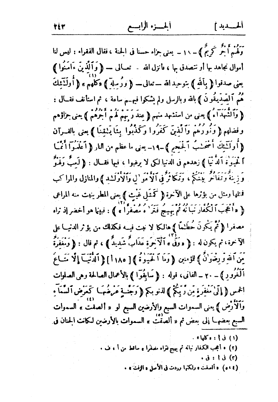 وَالشُّهَداءُ يعني من استشهد منهم عِنْدَ رَبِّهِمْ لَهُمْ أَجْرُهُمْ يعني جزاؤهم وفضلهم وَنُورُهُمْ وَالَّذِينَ كَفَرُوا وَكَذَّبُوا بِآياتِنا يعني بالقرآن أُولئِكَ أَصْحابُ الْجَحِيمِ- 19- يعني ما عظم من النار اعْلَمُوا أَنَّمَا الْحَياةُ الدُّنْيا زهدهم في الدنيا لكي لا يرغبوا، فيها فقال: لَعِبٌ وَلَهْوٌ وَزِينَةٌ وَتَفاخُرٌ بَيْنَكُمْ، وَتَكاثُرٌ فِي الْأَمْوالِ وَالْأَوْلادِ والمنازل والمراكب فمثلها ومثل من يؤثرها على الآخرة كَمَثَلِ غَيْثٍ يعني المطر ينبت منه المراعي «أَعْجَبَ الْكُفَّارَ نَباتُهُ ثُمَّ يَهِيجُ فَتَراهُ مُصْفَرًّا» «2» : فبينما هو أخضر إذ تراه مصفرا ثُمَّ يَكُونُ حُطاماً هالكا لا نبت فيه فكذلك من يؤثر الدنيا على الآخرة، ثم يكون له: «وَفِي» «3» الْآخِرَةِ عَذابٌ شَدِيدٌ، ثم قال: وَمَغْفِرَةٌ مِنَ اللَّهِ وَرِضْوانٌ للمؤمنين وَمَا الْحَياةُ [185 أ] الدُّنْيا إِلَّا مَتاعُ الْغُرُورِ- 20- الفاني، قوله: سابِقُوا بالأعمال الصالحة وهي الصلوات الخمس إِلى مَغْفِرَةٍ مِنْ رَبِّكُمْ لذنوبكم وَجَنَّةٍ عَرْضُها كَعَرْضِ السَّماءِ وَالْأَرْضِ يعني السموات السبع والأرضين السبع لو «ألصقت» «4» السموات السبع بعضها إلى بعض ثم «ألصقت» «5» السموات بالأرضين لكانت الجنان فى