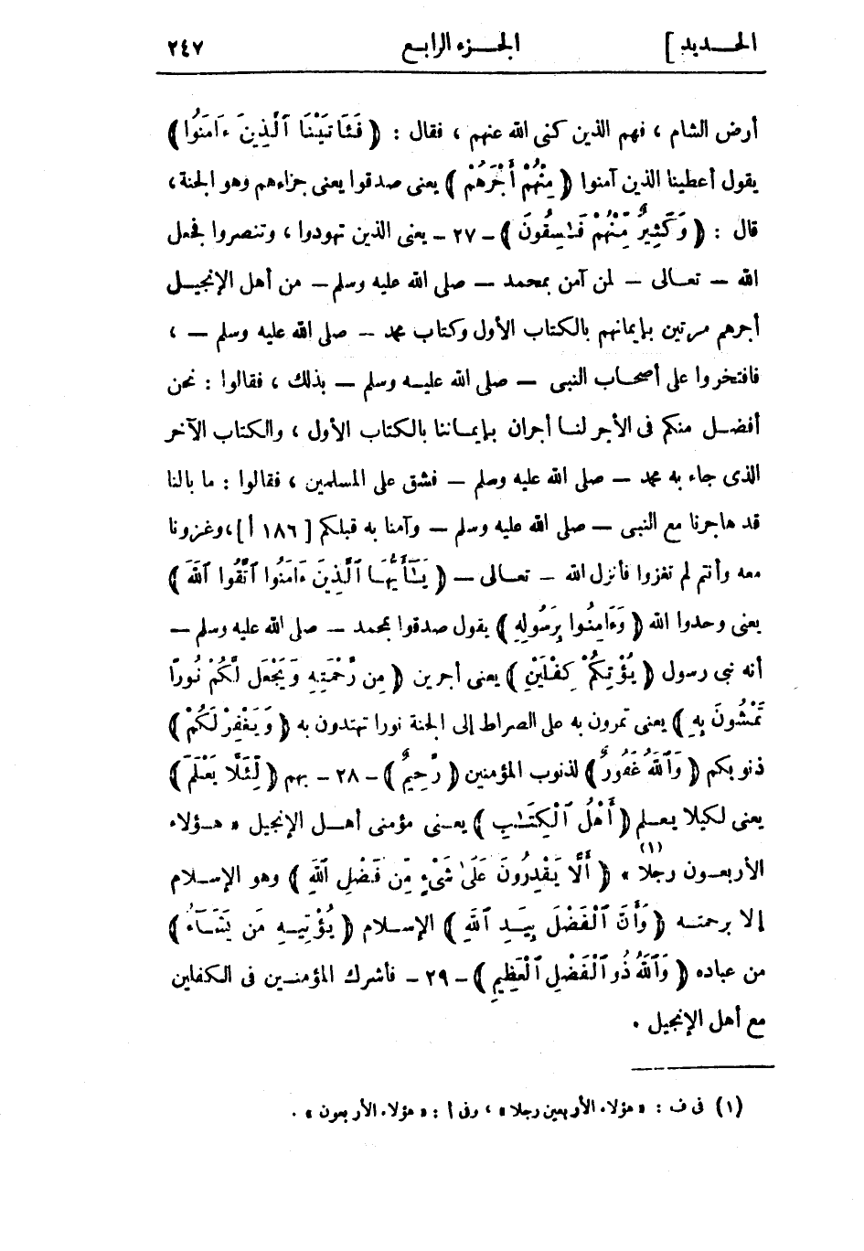 أرض الشام، فهم الذين كنى الله عنهم، فقال: فَآتَيْنَا الَّذِينَ آمَنُوا يقول أعطينا الذين آمنوا مِنْهُمْ أَجْرَهُمْ يعني صدقوا يعني جزاءهم وهو الجنة، قال: وَكَثِيرٌ مِنْهُمْ فاسِقُونَ- 27- يعني الذين تهودوا، وتنصروا فجعل الله- تعالى- لمن آمن بمحمد- صلى الله عليه وسلم- من أهل الإنجيل أجرهم مرتين بإيمانهم بالكتاب الأول وكتاب محمد- صلى الله عليه وسلم-، فافتخروا على أصحاب النبي- صلى الله عليه وسلم- بذلك، فقالوا: نحن أفضل منكم في الأجر لنا أجران بإيماننا بالكتاب الأول، والكتاب الآخر الَّذِي جاء به محمد- صَلَّى اللَّهُ عَلَيْهِ وسلم- فشق على المسلمين، فقالوا: ما بالنا قد هاجرنا مع النبي- صلى الله عليه وسلم- وآمنا به قبلكم [186 أ] ، وغزونا معه وأنتم لم تغزوا فأنزل الله- تعالى- يا أَيُّهَا الَّذِينَ آمَنُوا اتَّقُوا اللَّهَ يعني وحدوا الله وَآمِنُوا بِرَسُولِهِ يقول صدقوا بمحمد- صلى الله عليه وسلم- أنه نبي رسول يُؤْتِكُمْ كِفْلَيْنِ يعني أجرين مِنْ رَحْمَتِهِ وَيَجْعَلْ لَكُمْ نُوراً تَمْشُونَ بِهِ يعني تمرون به على الصراط إلى الجنة نورا تهتدون به وَيَغْفِرْ لَكُمْ ذنوبكم وَاللَّهُ غَفُورٌ لذنوب المؤمنين رَحِيمٌ- 28- بهم لِئَلَّا يَعْلَمَ يعني لكيلا يعلم أَهْلُ الْكِتابِ يعني مؤمني أهل الإنجيل «هؤلاء الأربعون رجلا» «1» أَلَّا يَقْدِرُونَ عَلى شَيْءٍ مِنْ فَضْلِ اللَّهِ وهو الإسلام إلا برحمته وَأَنَّ الْفَضْلَ بِيَدِ اللَّهِ الإسلام يُؤْتِيهِ مَنْ يَشاءُ من عباده وَاللَّهُ ذُو الْفَضْلِ الْعَظِيمِ- 29- فأشرك المؤمنين في الكفلين مع أهل الإنجيل.