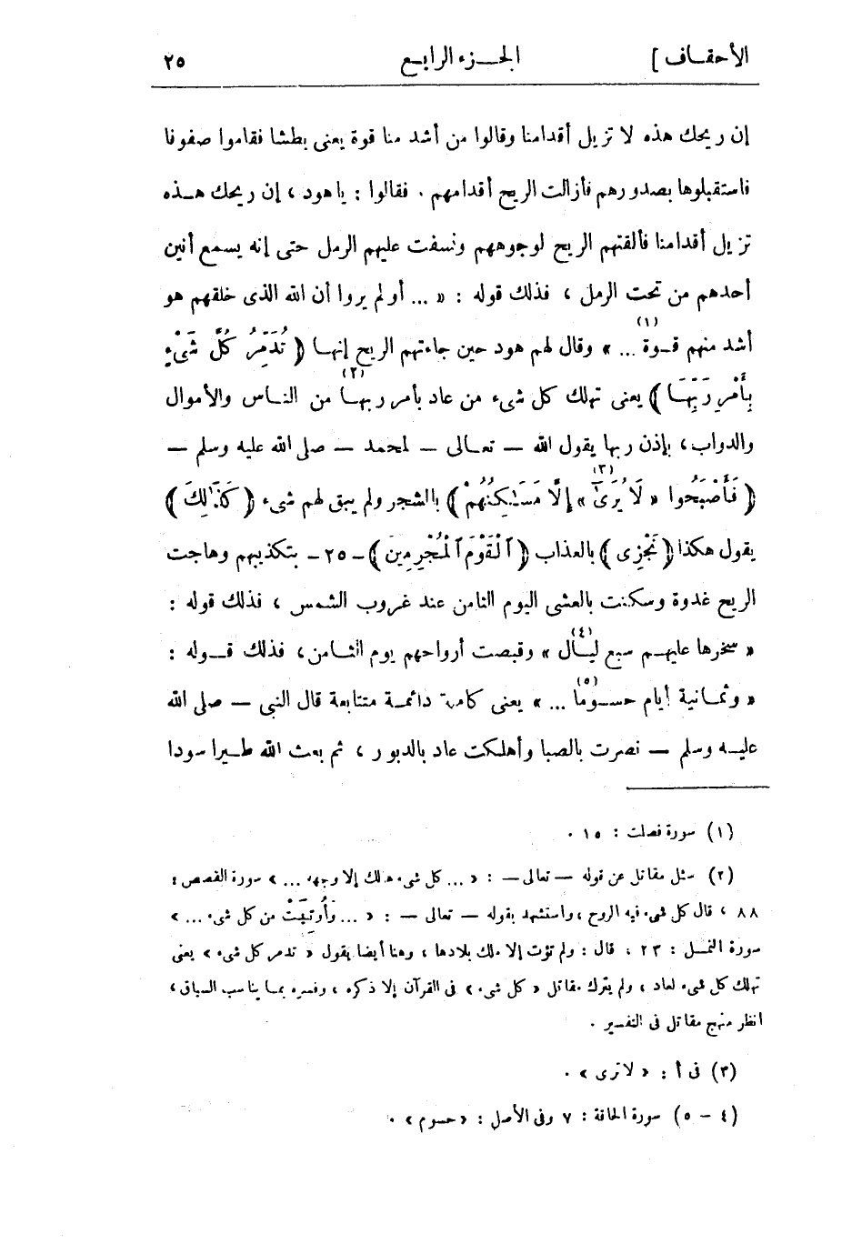 سورة النمل: 23، قال: ولم تؤت إلا ملك بلادها، وهنا أيضا يقول «تُدَمِّرُ كُلَّ شَيْءٍ» يعنى تهلك كل شيء لعاد، ولم يترك مقاتل «كُلَّ شَيْءٍ» فى القرآن إلا ذكره، وفسره بما يناسب السياق، انظر منهج مقاتل فى التفسير.