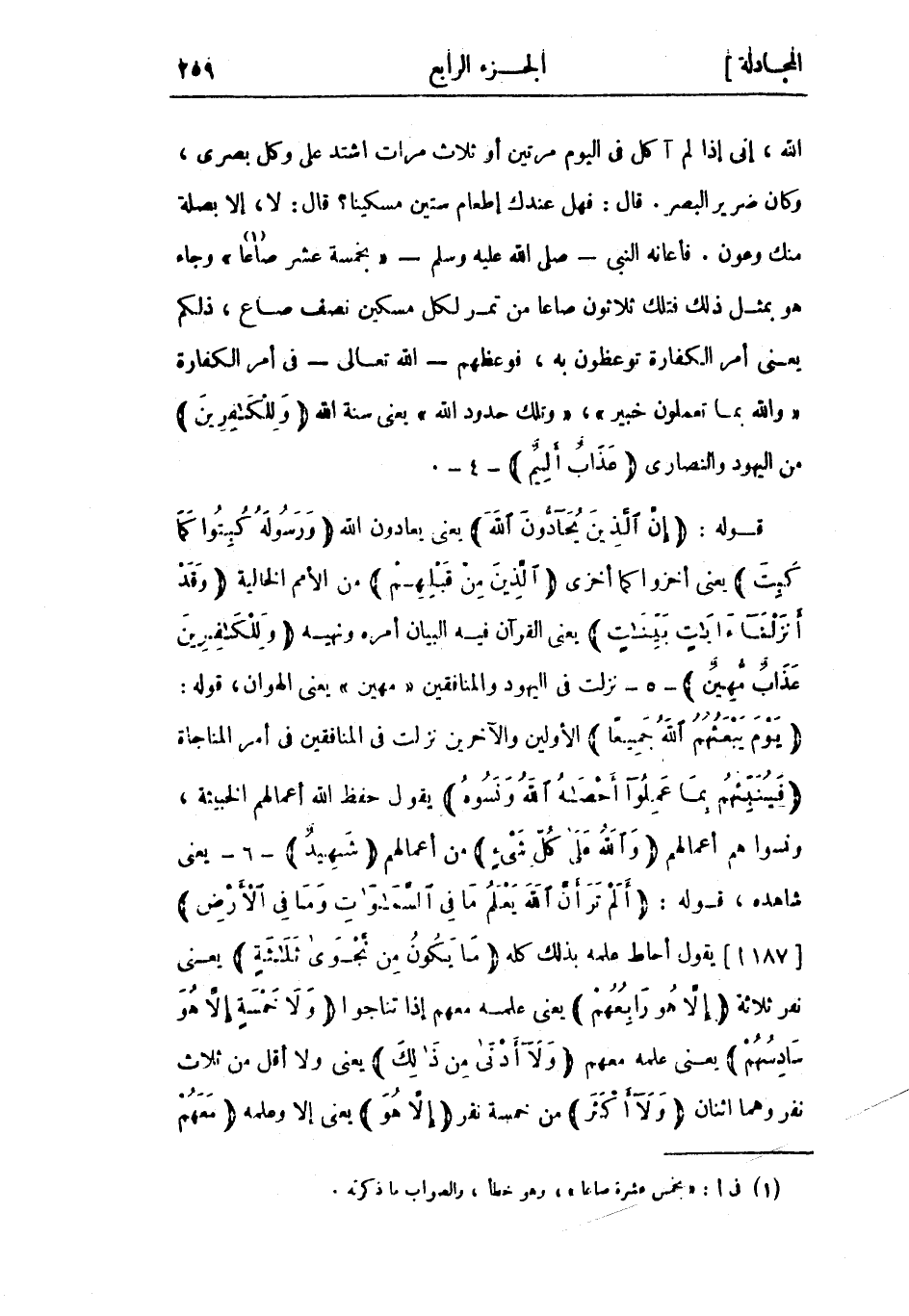 وجاء هو بمثل ذلك فتلك ثلاثون صاعا من تمر لكل مسكين نصف صاع، ذلكم يعني أمر الكفارة توعظون به، فوعظهم- الله تعالى- فى أمر الكفارة «وَاللَّهُ بِما تَعْمَلُونَ خَبِيرٌ» ، «وَتِلْكَ حُدُودُ اللَّهِ» يعني سنة الله وَلِلْكافِرِينَ من اليهود والنصارى عَذابٌ أَلِيمٌ- 4- قوله: إِنَّ الَّذِينَ يُحَادُّونَ اللَّهَ يعني يعادون الله وَرَسُولَهُ كُبِتُوا كَما كُبِتَ يعني أخزوا كما أخزى الَّذِينَ مِنْ قَبْلِهِمْ من الأمم الخالية وَقَدْ أَنْزَلْنا آياتٍ بَيِّناتٍ يعني القرآن فيه البيان أمره ونهيه وَلِلْكافِرِينَ عَذابٌ مُهِينٌ- 5- نزلت في اليهود والمنافقين «مُهِينٌ» يعني الهوان، قوله: