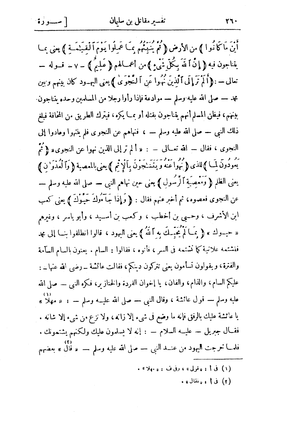 مَعَهُمْ أَيْنَ ما كانُوا من الأرض ثُمَّ يُنَبِّئُهُمْ بِما عَمِلُوا يَوْمَ الْقِيامَةِ يعني بما يتناجون فيه إِنَّ اللَّهَ بِكُلِّ شَيْءٍ من أعمالهم عَلِيمٌ- 7- قوله- تعالى-: أَلَمْ تَرَ إِلَى الَّذِينَ نُهُوا عَنِ النَّجْوى يعني اليهود كان بينهم وبين محمد- صلى الله عليه وسلم- موادعة فإذا رأوا رجلا من المسلمين وحده يتناجون بينهم، فيظن المسلم أنهم يتناجون بقتله أو بما يكره، فيترك الطريق من المخافة فبلغ ذَلِكَ النَّبِيّ- صَلَّى اللَّهُ عَلَيْهِ وَسَلَّمَ-، فنهاهم عن النجوى فلم ينتهوا وعادوا إلى النجوى، فقال- الله تعالى-: «أَلَمْ تَرَ إِلَى الَّذِينَ نُهُوا عَنِ النَّجْوى» ثُمَّ يَعُودُونَ لِما للذي نُهُوا عَنْهُ وَيَتَناجَوْنَ بِالْإِثْمِ يعني بالمعصية وَالْعُدْوانِ يعني الظلم وَمَعْصِيَةِ الرَّسُولِ يعني حين نهاهم النبي- صلى الله عليه وسلم- عن النجوى فعصوه، ثم أخبر عنهم قال: وَإِذا جاؤُكَ حَيَّوْكَ يعني كعب بن الأشرف، وحيي بن أخطب، وكعب بن أسيد، وأبو ياسر، وغيرهم «حَيَّوْكَ» بِما لَمْ يُحَيِّكَ بِهِ اللَّهُ يعني اليهود، قالوا انطلقوا بنا إلى محمد فنشتمه علانية كما نشتمه فى السر، فأتوه، فقالوا: السام. يعنون بالسام السآمة والفترة، ويقولون تسأمون يعني تتزكون دينكم،