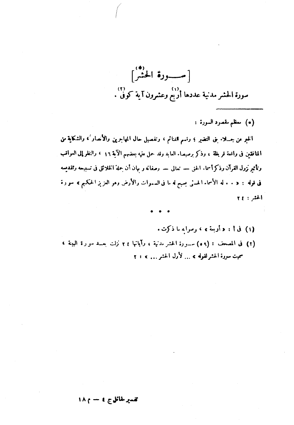 (3) فى المصحف: (59) سورة الحشر مدنية، وآياتها 24 نزلت بعد سورة البينة، سميت سورة الحشر لقوله « ... لِأَوَّلِ الْحَشْرِ ... » : 2