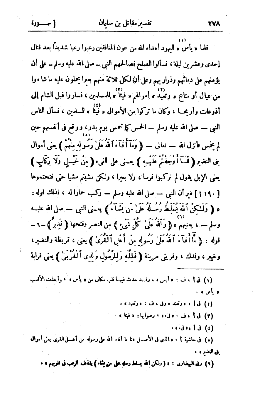 (5) فى حاشية أ: «الذي فى الأصل هنا مَا أَفَاءَ اللَّهُ عَلَى رَسُولِهِ مِنْ أَهْلِ القرى يعنى أموال بنى النضير» .