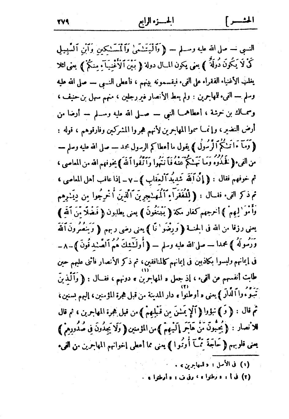 وَما آتاكُمُ الرَّسُولُ يقول ما أعطاكم الرسول محمد- صلى الله عليه وسلم- من الفيء فَخُذُوهُ وَما نَهاكُمْ عَنْهُ فَانْتَهُوا وَاتَّقُوا اللَّهَ يخوفهم الله من المعاصي، ثم خوفهم فقال: إِنَّ اللَّهَ شَدِيدُ الْعِقابِ- 7- إذا عاقب أهل المعاصي، ثم ذكر الفيء فقال: لِلْفُقَراءِ الْمُهاجِرِينَ الَّذِينَ أُخْرِجُوا مِنْ دِيارِهِمْ وَأَمْوالِهِمْ أخرجهم كفار مكة يَبْتَغُونَ يعني يطلبون فَضْلًا مِنَ اللَّهِ يعني رزقا من الله في الجنة وَرِضْواناً يعنى رضى ربهم وَيَنْصُرُونَ اللَّهَ وَرَسُولَهُ محمدا- صلى الله عليه وسلم- أُولئِكَ هُمُ الصَّادِقُونَ- 8- في إيمانهم وليسوا بكاذبين في إيمانهم كالمنافقين، ثم ذكر الأنصار فأثنى عليهم حين طابت أنفسهم عن الفيء، إذ جعل «المهاجرين» «1» دونهم، فقال: وَالَّذِينَ تَبَوَّؤُا الدَّارَ يعني «أوطنوا» «2» دار المدينة من قبل هجرة المؤمنين، إليهم بسنين، ثم قال: وَتبؤوا الْإِيمانَ مِنْ قَبْلِهِمْ من قبل هجرة المهاجرين، ثم قال للأنصار: يُحِبُّونَ مَنْ هاجَرَ إِلَيْهِمْ من المؤمنين وَلا يَجِدُونَ فِي صُدُورِهِمْ يعنى قلوبهم حاجَةً مِمَّا أُوتُوا يعني مما أعطى إخوانهم المهاجرين من الفيء