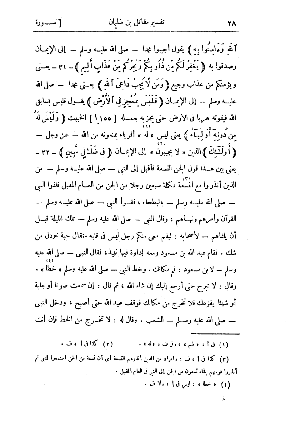 (3) كذا فى ا، ف: والمراد من الذين أنذرهم التسعة أى أن تسعة من الجن استمعوا للنبي ثم أنذروا قومهم فجاء تسعون من الجن إلى النبي فى العام المقبل.