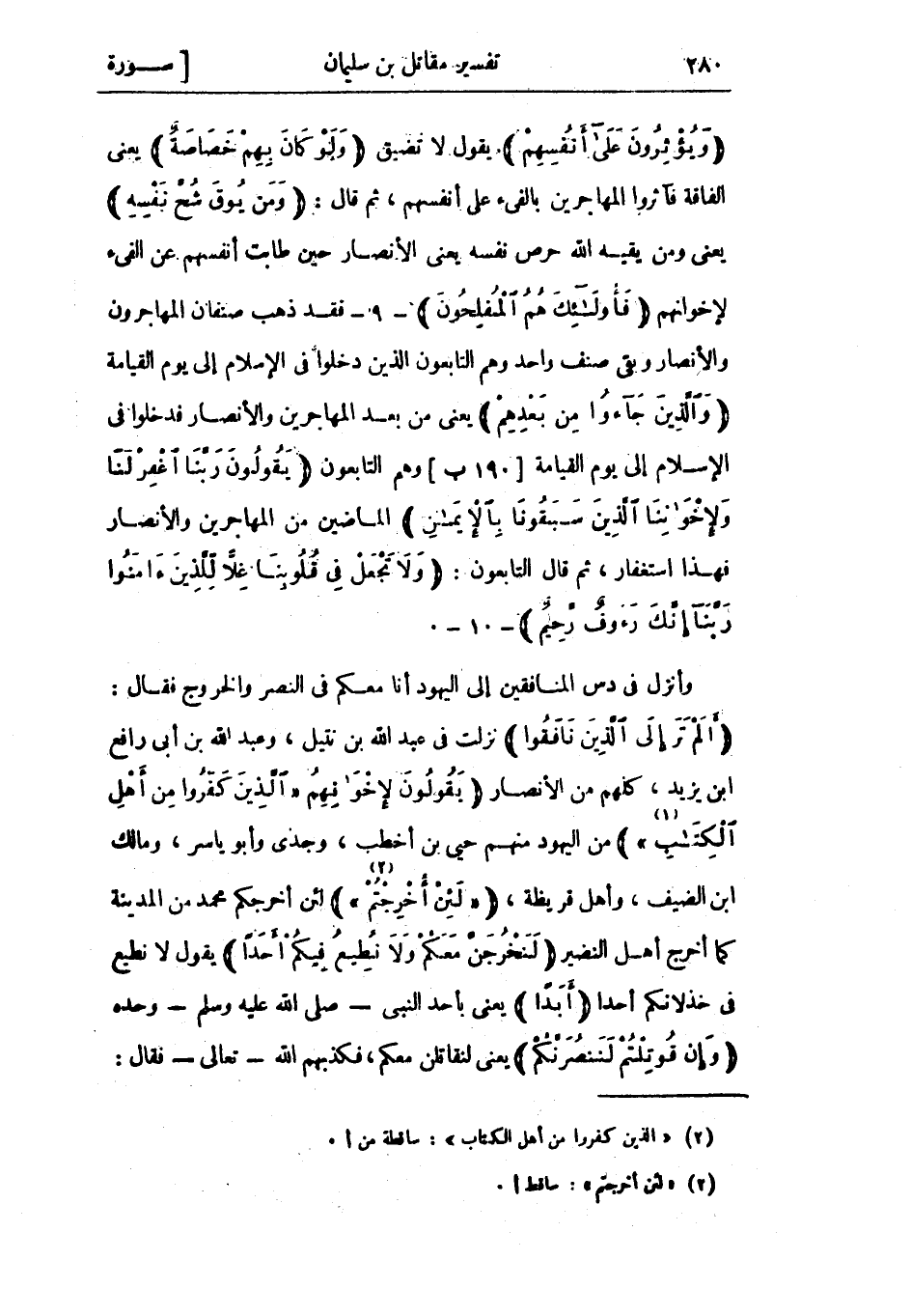 وَيُؤْثِرُونَ عَلى أَنْفُسِهِمْ يقول لا تضيق وَلَوْ كانَ بِهِمْ خَصاصَةٌ يعني الفاقة فآثروا المهاجرين بالفيء على أنفسهم، ثم قال: وَمَنْ يُوقَ شُحَّ نَفْسِهِ يعني ومن يقيه الله حرص نفسه يعني الأنصار حين طابت أنفسهم عن الفيء لإخوانهم فَأُولئِكَ هُمُ الْمُفْلِحُونَ- 9- فقد ذهب صنفان المهاجرون والأنصار وبقي صنف واحد وهم التابعون الذين دخلوا في الإسلام إلى يوم القيامة وَالَّذِينَ جاؤُ مِنْ بَعْدِهِمْ يعني من بعد المهاجرين والأنصار فدخلوا في الإسلام إلى يوم القيامة [190 ب] وهم التابعون يَقُولُونَ رَبَّنَا اغْفِرْ لَنا وَلِإِخْوانِنَا الَّذِينَ سَبَقُونا بِالْإِيمانِ الماضين من المهاجرين والأنصار فهذا استغفار، ثم قال التابعون: وَلا تَجْعَلْ فِي قُلُوبِنا غِلًّا لِلَّذِينَ آمَنُوا رَبَّنا إِنَّكَ رَؤُفٌ رَحِيمٌ- 10-.