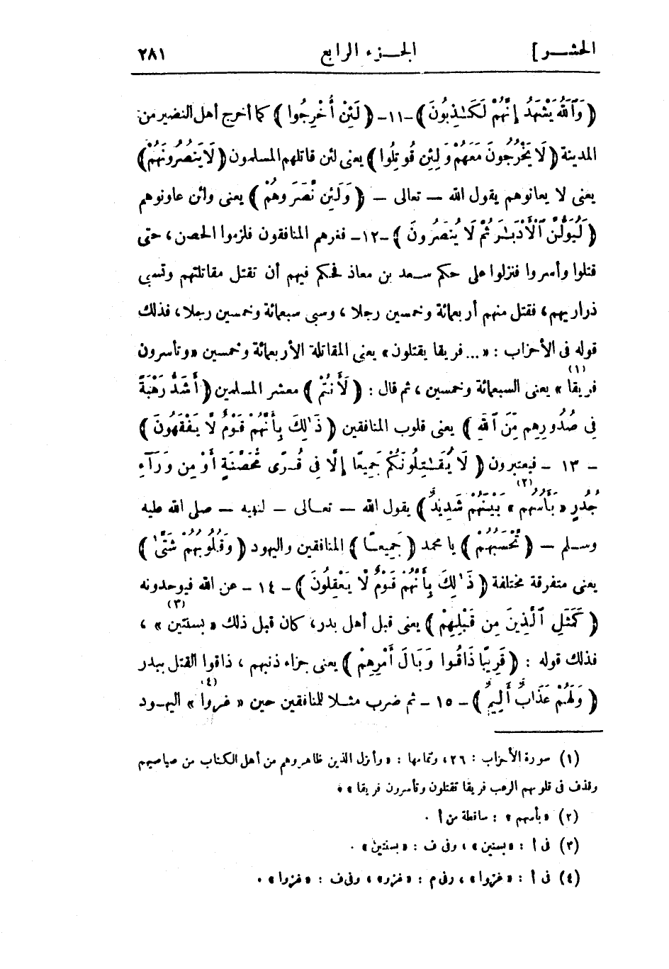 (1) سورة الأحزاب: 26، وتمامها: «وَأَنْزَلَ الَّذِينَ ظاهَرُوهُمْ مِنْ أَهْلِ الْكِتابِ مِنْ صَياصِيهِمْ وَقَذَفَ فِي قُلُوبِهِمُ الرُّعْبَ فَرِيقاً تَقْتُلُونَ وَتَأْسِرُونَ فَرِيقاً» . [.....]