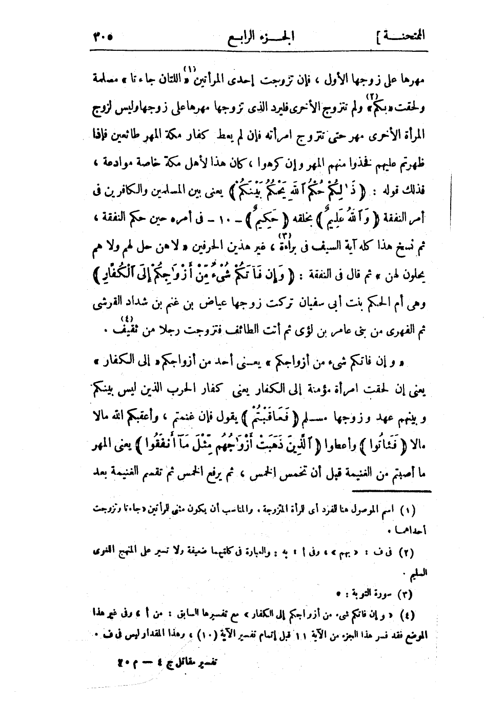 (4) «وَإِنْ فاتَكُمْ شَيْءٌ مِنْ أَزْواجِكُمْ إِلَى الْكُفَّارِ» مع تفسيرها السابق: من أ، وفى غير هذا الموضع فقد فسر هذا الجزء من الآية 11 قبل إتمام تفسير الآية (10) ، وهذا المقدار ليس فى ف.