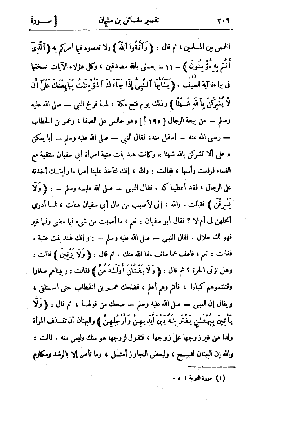 الخمس بين المسلمين، ثم قال: وَاتَّقُوا اللَّهَ ولا تعصوه فيما أمركم به الَّذِي أَنْتُمْ بِهِ مُؤْمِنُونَ- 11- يعني بالله مصدقين، وكل هؤلاء الآيات نسختها فى براءة آية السيف «1» . يا أَيُّهَا النَّبِيُّ إِذا جاءَكَ الْمُؤْمِناتُ يُبايِعْنَكَ عَلى أَنْ لا يُشْرِكْنَ بِاللَّهِ شَيْئاً وذلك يوم فتح مكة،