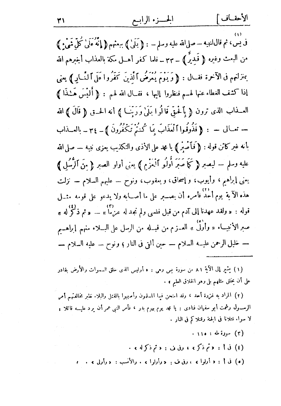 في يس «1» ، ثُمّ قَالَ لنبيه- صَلَّى اللَّهُ عَلَيْهِ وَسَلَّمَ-: بَلى ببعثهم إِنَّهُ عَلى كُلِّ شَيْءٍ من البعث وغيره قَدِيرٌ- 33- فلما كفر أهل مكة بالعذاب أخبرهم الله بمنزلتهم فى الآخرة فقال: وَيَوْمَ يُعْرَضُ الَّذِينَ كَفَرُوا عَلَى النَّارِ يعني إذا كشف الغطاء عنها لهم فنظروا إليها، فقال الله لهم: أَلَيْسَ هَذَا العذاب الذي ترون بِالْحَقِّ قالُوا بَلى وَرَبِّنا أنه الحق قالَ الله- تعالى-: فَذُوقُوا الْعَذابَ بِما كُنْتُمْ تَكْفُرُونَ- 34- بالعذاب بأنه غير كائن قوله: فَاصْبِرْ يا محمد على الأذى والتكذيب يعزي نبيه- صلى الله عليه وسلم- ليصبر كَما صَبَرَ أُولُوا الْعَزْمِ يعني أولو الصبر مِنَ الرُّسُلِ يعني إبراهيم، وأيوب، وإسحاق، ويعقوب، ونوح- عليهم السلام- نزلت هذه الآية يوم أحد «2» فأمره أن يصبر على ما أصابه ولا يدعو على قومه مثل قوله: وَلَقَدْ عَهِدْنا إِلى آدَمَ مِنْ قَبْلُ فَنَسِيَ وَلَمْ نَجِدْ لَهُ عَزْماً «3» - «ثم ذكر «4» له» صبر الأنبياء «وأولي» «5» العزم من قبله من الرسل على البلاء منهم إبراهيم- خليل الرحمن عليه السلام- حين ألقي فى النار، ونوح- عليه السلام-