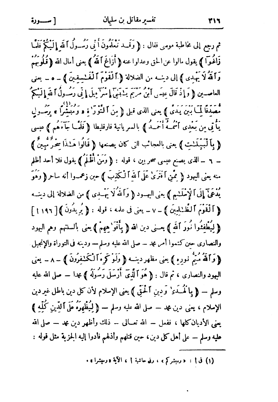 ثم رجع إلى مخاطبة موسى فقال: وَقَدْ تَعْلَمُونَ أَنِّي رَسُولُ اللَّهِ إِلَيْكُمْ فَلَمَّا زاغُوا يقول مالوا عن الحق وعدلوا عنه أَزاغَ اللَّهُ يعني أمال الله قُلُوبَهُمْ وَاللَّهُ لا يَهْدِي إلى دينه من الضلالة الْقَوْمَ الْفاسِقِينَ- 5- يعني العاصين وَإِذْ قالَ عِيسَى ابْنُ مَرْيَمَ يَا بَنِي إِسْرائِيلَ إِنِّي رَسُولُ اللَّهِ إِلَيْكُمْ مُصَدِّقاً لِما بَيْنَ يَدَيَّ يعني الذي قبلي مِنَ التَّوْراةِ «وَمُبَشِّراً «1» » بِرَسُولٍ يَأْتِي مِنْ بَعْدِي اسْمُهُ أَحْمَدُ بالسريانية فارقليطا فَلَمَّا جاءَهُمْ عيسى بِالْبَيِّناتِ يعني بالعجائب التي كان يصنعها قالُوا هَذَا سِحْرٌ مُبِينٌ- 6- الذي يصنع عيسى سحر بين، قوله: وَمَنْ أَظْلَمُ يقول فلا أحد أظلم منه يعني اليهود مِمَّنِ افْتَرى عَلَى اللَّهِ الْكَذِبَ حين زعموا أنه ساحر وَهُوَ يُدْعى إِلَى الْإِسْلامِ يعني اليهود وَاللَّهُ لا يَهْدِي من الضلالة إلى دينه الْقَوْمَ الظَّالِمِينَ- 7- يعني فى علمه، قوله: يُرِيدُونَ [196 أ] لِيُطْفِؤُا نُورَ اللَّهِ يعني دين الله بِأَفْواهِهِمْ يعني بألسنتهم وهم اليهود والنصارى حين كتموا أمر محمد- صَلَّى اللَّهُ عَلَيْهِ وَسَلَّمَ- ودينه في التوراة والإنجيل وَاللَّهُ مُتِمُّ نُورِهِ يعني مظهر دينه وَلَوْ كَرِهَ الْكافِرُونَ- 8- يعني اليهود والنصارى، ثم قال: هُوَ الَّذِي أَرْسَلَ رَسُولَهُ محمدا- صلى الله عليه وسلم- بِالْهُدى وَدِينِ الْحَقِّ يعني الإسلام لأن كل دين باطل غير دين الإسلام، يعني دين محمد- صلى الله عليه وسلم- لِيُظْهِرَهُ عَلَى الدِّينِ كُلِّهِ يعني الأديان كلها، ففعل- الله تعالى- ذلك وأظهر دين محمد- صلى الله عليه وسلم- على أهل كل دين، حين قتلهم وأذلهم فأدوا إليه الجزية مثل قوله: