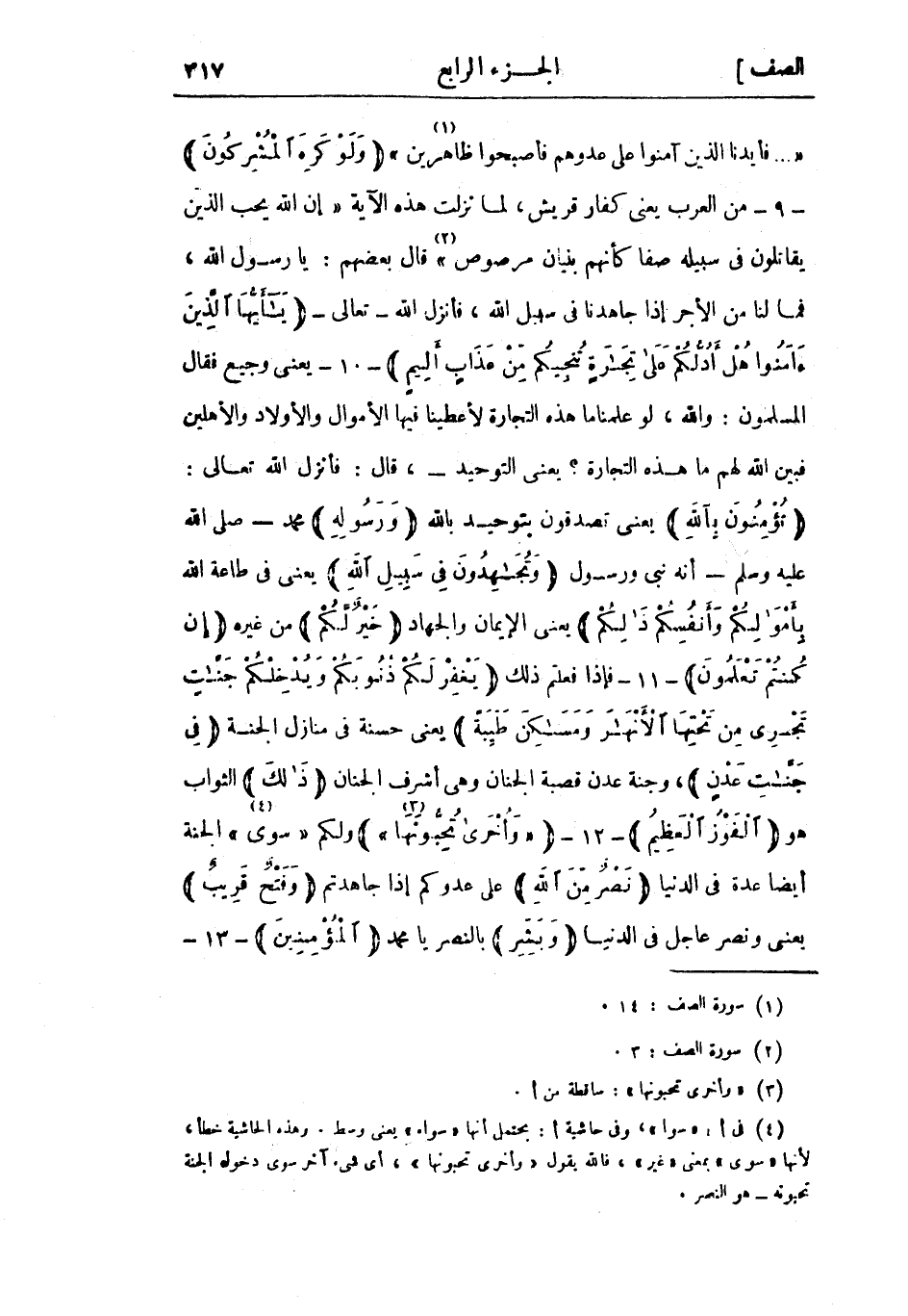 « ... فَأَيَّدْنَا الَّذِينَ آمَنُوا عَلى عَدُوِّهِمْ فَأَصْبَحُوا ظاهِرِينَ «1» » وَلَوْ كَرِهَ الْمُشْرِكُونَ- 9- من العرب يعني كفار قريش، لما نزلت هذه الآية «إِنَّ اللَّهَ يُحِبُّ الَّذِينَ يُقاتِلُونَ فِي سَبِيلِهِ صَفًّا كَأَنَّهُمْ بُنْيانٌ مَرْصُوصٌ «2» » قال بعضهم: يا رسول الله، فما لنا من الأجر إذا جاهدنا في سبيل الله، فأنزل الله- تعالى- يا أَيُّهَا الَّذِينَ آمَنُوا هَلْ أَدُلُّكُمْ عَلى تِجارَةٍ تُنْجِيكُمْ مِنْ عَذابٍ أَلِيمٍ- 10- يعني وجيع فقال المسلمون: والله، لو علمنا ما هذه التجارة لأعطينا فيها الأموال والأولاد والأهلين فبين الله لهم ما هذه التجارة؟ يعني التوحيد-، قال: فأنزل الله تعالى: