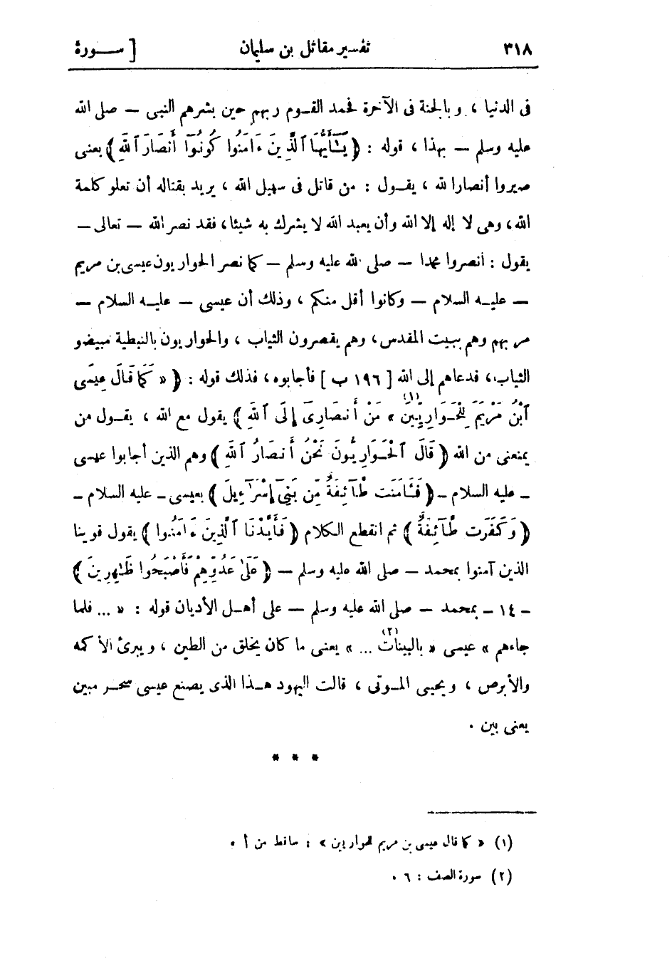 في الدنيا، وبالجنة في الآخرة فحمد القوم ربهم حين بشرهم النبي- صلى الله عليه وسلم- بهذا، قوله: يا أَيُّهَا الَّذِينَ آمَنُوا كُونُوا أَنْصارَ اللَّهِ يعني صيروا أنصار الله، يقول: من قاتل فى سهيل الله، يريد بقتاله أن تعلو كلمة الله، وهي لا إله إلا الله وأن يعبد الله لا يشرك به شيئا، فقد نصر الله- تعالى- يقول: انصروا محمدا- صلى الله عليه وسلم- كما نصر الحواريون عيسى بن مريم- عليه السلام- وكانوا أقل منكم، وذلك أن عيسى- عليه السلام- مر بهم وهم ببيت المقدس، وهم يقصرون الثياب، والحواريون بالنبطية مبيضو الثياب، فدعاهم إلى الله [196 ب] فأجابوه، فذلك قوله: «كَما قالَ عِيسَى ابْنُ مَرْيَمَ لِلْحَوارِيِّينَ «1» » مَنْ أَنْصارِي إِلَى اللَّهِ يقول مع الله، يقول من يمنعني من الله قالَ الْحَوارِيُّونَ نَحْنُ أَنْصارُ اللَّهِ وهم الذين أجابوا عيسى- عليه السلام- فَآمَنَتْ طائِفَةٌ مِنْ بَنِي إِسْرائِيلَ بعيسى- عليه السلام- وَكَفَرَتْ طائِفَةٌ ثم انقطع الكلام فَأَيَّدْنَا الَّذِينَ آمَنُوا يقول قوينا الذين آمنوا بمحمد- صلى الله عليه وسلم- عَلى عَدُوِّهِمْ فَأَصْبَحُوا ظاهِرِينَ- 14- بمحمد- صلى الله عليه وسلم- على أهل الأديان قوله: « ... فَلَمَّا جاءَهُمْ» عيسى «بِالْبَيِّناتِ «2» ... » يعني ما كان يخلق من الطين، ويبرئ الأكمه والأبرص، ويحيي الموتى، قالت اليهود هذا الذي يصنع عيسى سحر مبين يعني بين.