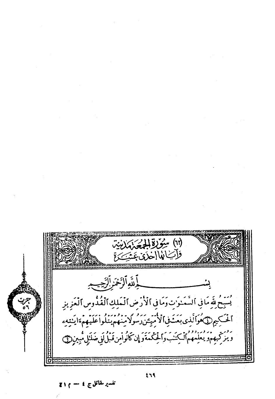 يُسَبِّحُ لِلَّهِ مَا فِي السَّماواتِ وَما فِي الْأَرْضِ الْمَلِكِ الْقُدُّوسِ الْعَزِيزِ الْحَكِيمِ (1) هُوَ الَّذِي بَعَثَ فِي الْأُمِّيِّينَ رَسُولاً مِنْهُمْ يَتْلُوا عَلَيْهِمْ آياتِهِ وَيُزَكِّيهِمْ وَيُعَلِّمُهُمُ الْكِتابَ وَالْحِكْمَةَ وَإِنْ كانُوا مِنْ قَبْلُ لَفِي ضَلالٍ مُبِينٍ (2) وَآخَرِينَ مِنْهُمْ لَمَّا يَلْحَقُوا بِهِمْ وَهُوَ الْعَزِيزُ الْحَكِيمُ (3) ذلِكَ فَضْلُ اللَّهِ يُؤْتِيهِ مَنْ يَشاءُ وَاللَّهُ ذُو الْفَضْلِ الْعَظِيمِ (4)