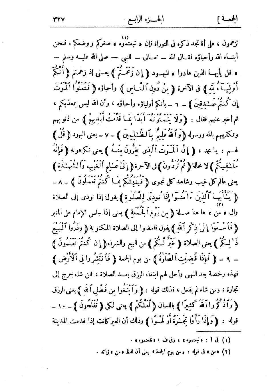 تزعمون، على أنا نجد ذكره في التوراة فإن «تبعتموه «1» » صغركم ووضعكم. فنحن أبناء الله وأحباؤه فقال الله- تعالى- للنبي- صلى الله عليه وسلم- «قُلْ يا أَيُّهَا الَّذِينَ هادُوا» لليهود إِنْ زَعَمْتُمْ يعني إذ زعمتم أَنَّكُمْ أَوْلِياءُ لِلَّهِ فى الآخرة مِنْ دُونِ النَّاسِ وأحباؤه فَتَمَنَّوُا الْمَوْتَ إِنْ كُنْتُمْ صادِقِينَ- 6- بأنكم أولياؤه وأحباؤه، وأن الله ليس بمعذبكم، ثم أخبر عنهم فقال: وَلا يَتَمَنَّوْنَهُ أَبَداً بِما قَدَّمَتْ أَيْدِيهِمْ من ذنوبهم وتكذيبهم بِاللَّه ورسوله وَاللَّهُ عَلِيمٌ بِالظَّالِمِينَ- 7- يعنى اليهود قُلْ لهم: يا محمد، إِنَّ الْمَوْتَ الَّذِي تَفِرُّونَ مِنْهُ يعني تكرهونه فَإِنَّهُ مُلاقِيكُمْ لا محالة ثُمَّ تُرَدُّونَ في الآخرة إِلى عالِمِ الْغَيْبِ وَالشَّهادَةِ يعني عالم كل غيب وشاهد كل نجوى فَيُنَبِّئُكُمْ بِما كُنْتُمْ تَعْمَلُونَ- 8- يا أَيُّهَا الَّذِينَ آمَنُوا إِذا نُودِيَ لِلصَّلاةِ يقول إذا نودي إلى الصلاة وال «من «2» » ها هنا صلة مِنْ يَوْمِ الْجُمُعَةِ يعني إذا جلس الإمام على المنبر فَاسْعَوْا إِلى ذِكْرِ اللَّهِ يقول فامضوا إلى الصلاة المكتوبة وَذَرُوا الْبَيْعَ ذلِكُمْ يعني الصلاة خَيْرٌ لَكُمْ من البيع والشراء إِنْ كُنْتُمْ تَعْلَمُونَ- 9- فَإِذا قُضِيَتِ الصَّلاةُ من يوم الجمعة فَانْتَشِرُوا فِي الْأَرْضِ فهذه رخصة بعد النهى وأحل لهم ابتغاء الرزق بعد الصلاة، فمن شاء خرج إلى تجارة، ومن شاء لم يفعل، فذلك قوله: وَابْتَغُوا مِنْ فَضْلِ اللَّهِ يعنى الرزق وَاذْكُرُوا اللَّهَ كَثِيراً باللسان لَعَلَّكُمْ يعنى لكي تُفْلِحُونَ- 10- قوله: وَإِذا رَأَوْا تِجارَةً أَوْ لَهْواً وذلك