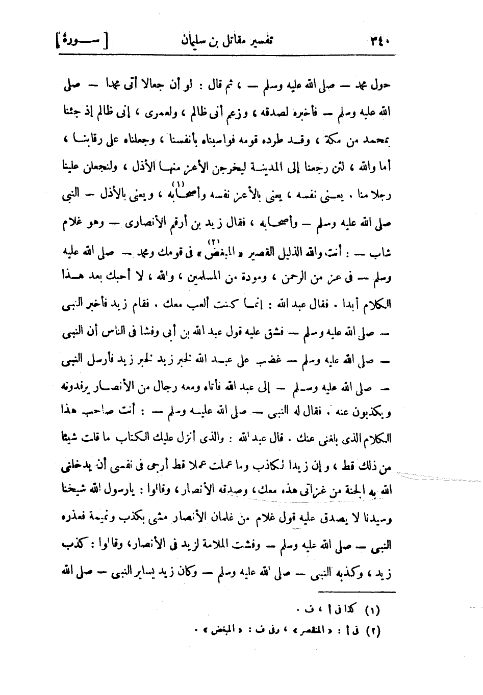 حول محمد- صَلَّى اللَّهُ عَلَيْهِ وَسَلَّمَ-، ثُمّ قَالَ: لو أن جعالا أتى محمدا- صلى الله عليه وسلم- فأخبره لصدقه، وزعم أني ظالم، ولعمري، إني ظالم إذ جئنا بمحمد من مكة، وقد طرده قومه فواسيناه بأنفسنا، وجعلناه على رقابنا، أما والله، لئن رجعنا إلى المدينة ليخرجن الأعز منها الأذل، ولنجعلن علينا رجلا منا. يعني نفسه، يعني بالأعز نفسه وأصحابه «1» ، ويعني بالأذل- النبي صلى الله عليه وسلم- وأصحابه، فقال زيد بن أرقم الأنصاري- وهو غلام شاب-: أنت والله الذليل القصير «المبغض «2» » في قومك ومحمد- صلى الله عليه وسلم- في عز من الرحمن، ومودة من المسلمين، والله، لا أحبك بعد هذا الكلام أبدا. فقال عبد الله: إنما كنت ألعب معك. فقام زيد فأخبر النبي- صلى الله عليه وسلم- فشق عليه قول عبد الله بن أبي وفشا في الناس أن النبي- صلى الله عليه وسلم- غضب على عبد الله لخبر زيد لخبر زيد فأرسل النبي- صلى الله عليه وسلم- إلى عبد الله فأتاه ومعه رجال من الأنصار يرفدونه ويكذبون عنه. فقال له النبي- صلى الله عليه وسلم-: أنت صاحب هذا الكلام الذي بلغني عنك. قال عبد الله: والذي أنزل عليك الكتاب ما قلت شيئا من ذلك قط، وإن زيدا لكاذب وما عملت عملا قط أرجى في نفسي أن يدخلني الله به الجنة من غزاتي هذه معك، وصدقه الأنصار، وقالوا: يا رسول الله شيخنا وسيدنا لا يصدق عليه قول غلام من غلمان الأنصار مشى بكذب ونميمة فعذره النبي- صلى الله عليه وسلم- وفشت الملامة لزيد في الأنصار، وقالوا: كذب زيد، وكذبه النبي- صلى الله عليه وسلم- وكان زيد يساير النبي- صلى الله