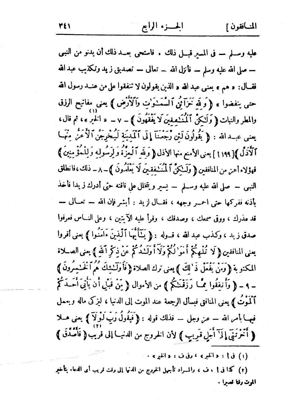 ، قوله: يا أَيُّهَا الَّذِينَ آمَنُوا يعني أقروا يعني المنافقين لا تُلْهِكُمْ أَمْوالُكُمْ وَلا أَوْلادُكُمْ عَنْ ذِكْرِ اللَّهِ يعنى الصلاة المكتوبة وَمَنْ يَفْعَلْ ذلِكَ يعني ترك الصلاة فَأُولئِكَ هُمُ الْخاسِرُونَ- 9- وَأَنْفِقُوا مِنْ ما رَزَقْناكُمْ من الأموال مِنْ قَبْلِ أَنْ يَأْتِيَ أَحَدَكُمُ الْمَوْتُ يعني المنافق فيسأل الرجعة عند الموت إلى الدنيا، ليزكي ماله ويعمل فيها بأمر الله- عز وجل- فذلك قوله: فَيَقُولَ رَبِّ لَوْلا يعنى هلا أَخَّرْتَنِي إِلى أَجَلٍ قَرِيبٍ لأن الخروج من الدنيا إلى قريب «2» فَأَصَّدَّقَ
