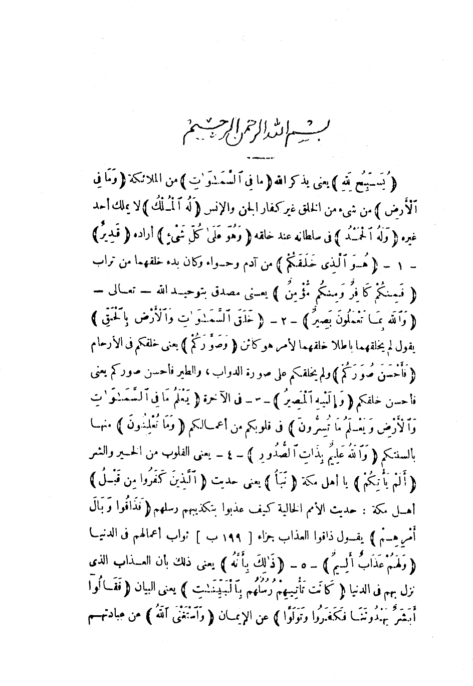 بِسْمِ اللَّهِ الرَّحْمنِ الرَّحِيمِ يُسَبِّحُ لِلَّهِ يعني يذكر الله مَا فِي السَّماواتِ من الملائكة وَما فِي الْأَرْضِ من شيء من الخلق غير كفار الجن والإنس لَهُ الْمُلْكُ لا يملك أحد غيره وَلَهُ الْحَمْدُ في سلطانه عند خلقه وَهُوَ عَلى كُلِّ شَيْءٍ أراده قَدِيرٌ- 1- هُوَ الَّذِي خَلَقَكُمْ من آدم وحواء وكان بدء خلقهما من تراب فَمِنْكُمْ كافِرٌ وَمِنْكُمْ مُؤْمِنٌ يعني مصدق بتوحيد الله- تعالى- وَاللَّهُ بِما تَعْمَلُونَ بَصِيرٌ- 2- خَلَقَ السَّماواتِ وَالْأَرْضَ بِالْحَقِّ يقول لَمْ يخلقهما باطلا خلقهما لأمر هُوَ كائن وَصَوَّرَكُمْ يعني خلقكم في الأرحام فَأَحْسَنَ صُوَرَكُمْ