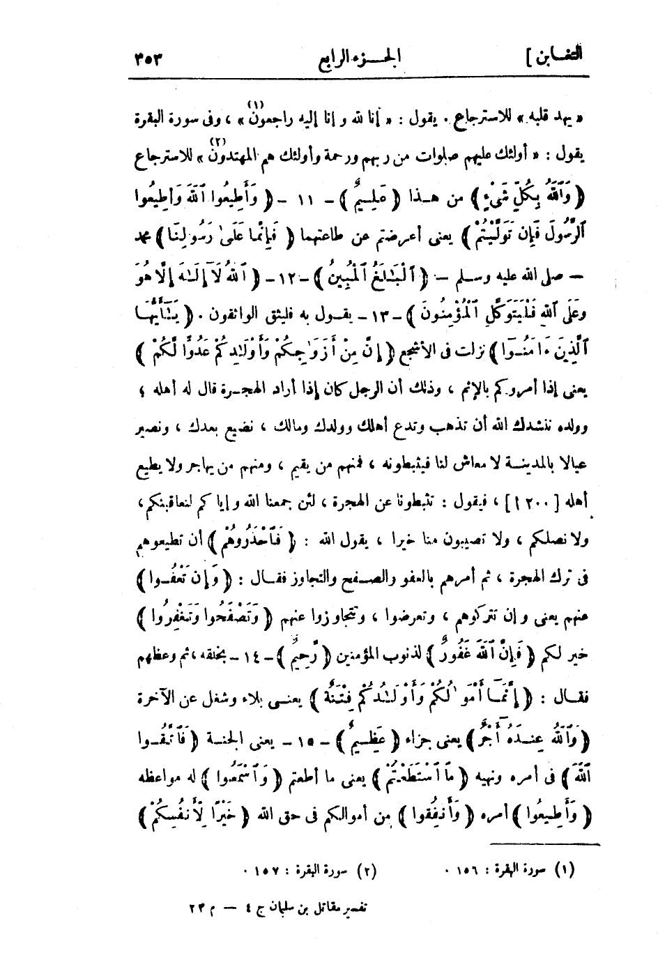 «يَهْدِ قَلْبَهُ» للاسترجاع. يقول: «إِنَّا لِلَّهِ وَإِنَّا إِلَيْهِ راجِعُونَ «1» » ، وفى سورة البقرة يقول: «أُولئِكَ عَلَيْهِمْ صَلَواتٌ مِنْ رَبِّهِمْ وَرَحْمَةٌ وَأُولئِكَ هُمُ الْمُهْتَدُونَ «2» » للاسترجاع وَاللَّهُ بِكُلِّ شَيْءٍ من هذا عَلِيمٌ- 11- وَأَطِيعُوا اللَّهَ وَأَطِيعُوا الرَّسُولَ فَإِنْ تَوَلَّيْتُمْ يعني أعرضتم عن طاعتهما فَإِنَّما عَلى رَسُولِنَا محمد- صَلَّى اللَّهُ عَلَيْهِ وَسَلَّمَ- الْبَلاغُ الْمُبِينُ- 12- اللَّهُ لا إِلهَ إِلَّا هُوَ وَعَلَى اللَّهِ فَلْيَتَوَكَّلِ الْمُؤْمِنُونَ- 13- يقول به فليثق الواثقون. يا أَيُّهَا الَّذِينَ آمَنُوا نزلت في الأشجع إِنَّ مِنْ أَزْواجِكُمْ وَأَوْلادِكُمْ عَدُوًّا لَكُمْ يعني إذا أمروكم بالإثم، وذلك أن الرجل كان إذا أراد الهجرة قال له أهله، وولده ننشدك الله أن تذهب وتدع أهلك وولدك ومالك، نضيع بعدك، ونصير عيالا بالمدينة لا معاش لنا فيثبطونه، فمنهم من يقيم، ومنهم من يهاجر ولا يطيع أهله [200 أ] ، فيقول: تثبطونا عن الهجرة، لئن جمعنا الله وإياكم لنعاقبنكم، ولا نصلكم، ولا تصيبون منا خيرا، يقول الله: فَاحْذَرُوهُمْ أن تطيعوهم في ترك الهجرة، ثم أمرهم بالعفو والصفح والتجاوز فقال: وَإِنْ تَعْفُوا عنهم يعني وإن تتركوهم، وتعرضوا، وتتجاوزوا عنهم وَتَصْفَحُوا وَتَغْفِرُوا خير لكم فَإِنَّ اللَّهَ غَفُورٌ لذنوب المؤمنين رَحِيمٌ- 14- بخلقه، ثم وعظهم فقال: نَّما أَمْوالُكُمْ وَأَوْلادُكُمْ فِتْنَةٌ