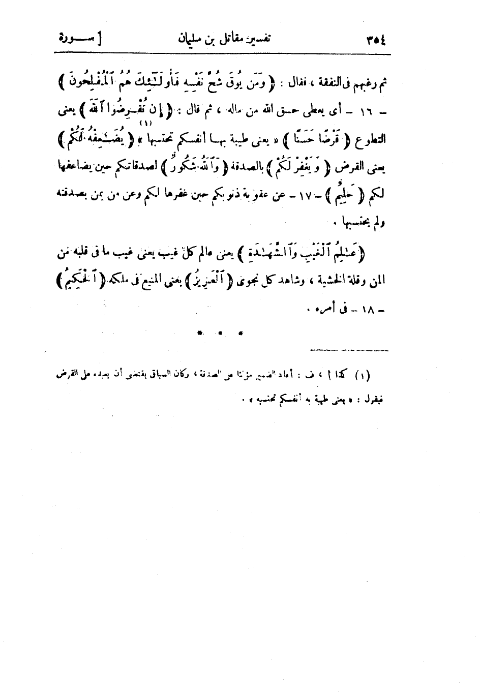 ثم رغبهم في النفقة، فقال: وَمَنْ يُوقَ شُحَّ نَفْسِهِ فَأُولئِكَ هُمُ الْمُفْلِحُونَ- 16- أى يعطى حق الله من ماله، ثم قال: إِنْ تُقْرِضُوا اللَّهَ يعني التطوع قَرْضاً حَسَناً «يعني طيبة بها أنفسكم تحتسبها «1» » يُضاعِفْهُ لَكُمْ يعني القرض وَيَغْفِرْ لَكُمْ بالصدقة وَاللَّهُ شَكُورٌ لصدقاتكم حين يضاعفها لكم حَلِيمٌ- 17- عن عقوبة ذنوبكم حين غفرها لكم وعن من بمن بصدقته ولم يحتسبها.