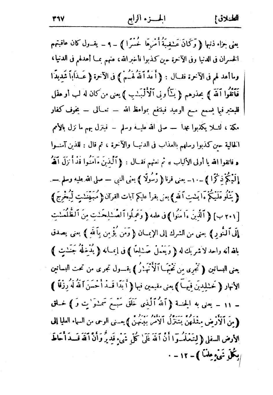 يعني جزاء ذنبها وَكانَ عاقِبَةُ أَمْرِها خُسْراً- 9- يقول كان عاقبتهم الخسران في الدنيا وفي الآخرة حين كذبوا فأخبر الله، عنهم بما أعدلهم في الدنيا، وما أعد لهم في الآخرة فقال: أَعَدَّ اللَّهُ لَهُمْ فى الآخرة عَذاباً شَدِيداً فَاتَّقُوا اللَّهَ يحذرهم يا أُولِي الْأَلْبابِ يعني من كان لَهُ لب أو عقل فليعتبر فيما يسمع مع الوعيد فينتفع بمواعظ الله- تعالى- يخوف كفار مكة، لئلا يكذبوا محمدا- صلى الله عليه وسلم- فينزل بهم ما نزل بالأمم الخالية حين كذبوا رسلهم بالعذاب في الدنيا والآخرة، ثم قال: للذين آمنوا «فَاتَّقُوا اللَّهَ يَا أُولِي الْأَلْبابِ» ثم نعتهم فقال: الَّذِينَ آمَنُوا قَدْ أَنْزَلَ اللَّهُ إِلَيْكُمْ ذِكْراً- 10- يعني قرنا رَسُولًا يعني النبي- صلى الله عليه وسلم- يَتْلُوا عَلَيْكُمْ آياتِ اللَّهِ يعني يقرأ عليكم آيات القرآن مُبَيِّناتٍ لِيُخْرِجَ [201 ب] الَّذِينَ آمَنُوا فى علمه وَعَمِلُوا الصَّالِحاتِ مِنَ الظُّلُماتِ إِلَى النُّورِ يعني من الشرك إلى الإيمان وَمَنْ يُؤْمِنْ بِاللَّهِ يعني يصدق بالله أنه واحد لا شريك له وَيَعْمَلْ صالِحاً في إيمانه يُدْخِلْهُ جَنَّاتٍ يعنى البساتين تَجْرِي مِنْ تَحْتِهَا الْأَنْهارُ يقول تجري من تحت البساتين الأنهار خالِدِينَ فِيها يعني مقيمين فيها أَبَداً قَدْ أَحْسَنَ اللَّهُ لَهُ رِزْقاً- 11- يعني به الجنة اللَّهُ الَّذِي خَلَقَ سَبْعَ سَماواتٍ وَخلق مِنَ الْأَرْضِ مِثْلَهُنَّ يَتَنَزَّلُ الْأَمْرُ بَيْنَهُنَّ يعني الوحي من السماء العليا إلى الأرض السفلى لِتَعْلَمُوا أَنَّ اللَّهَ عَلى كُلِّ شَيْءٍ قَدِيرٌ وَأَنَّ اللَّهَ قَدْ أَحاطَ بِكُلِّ شَيْءٍ عِلْماً- 12-.