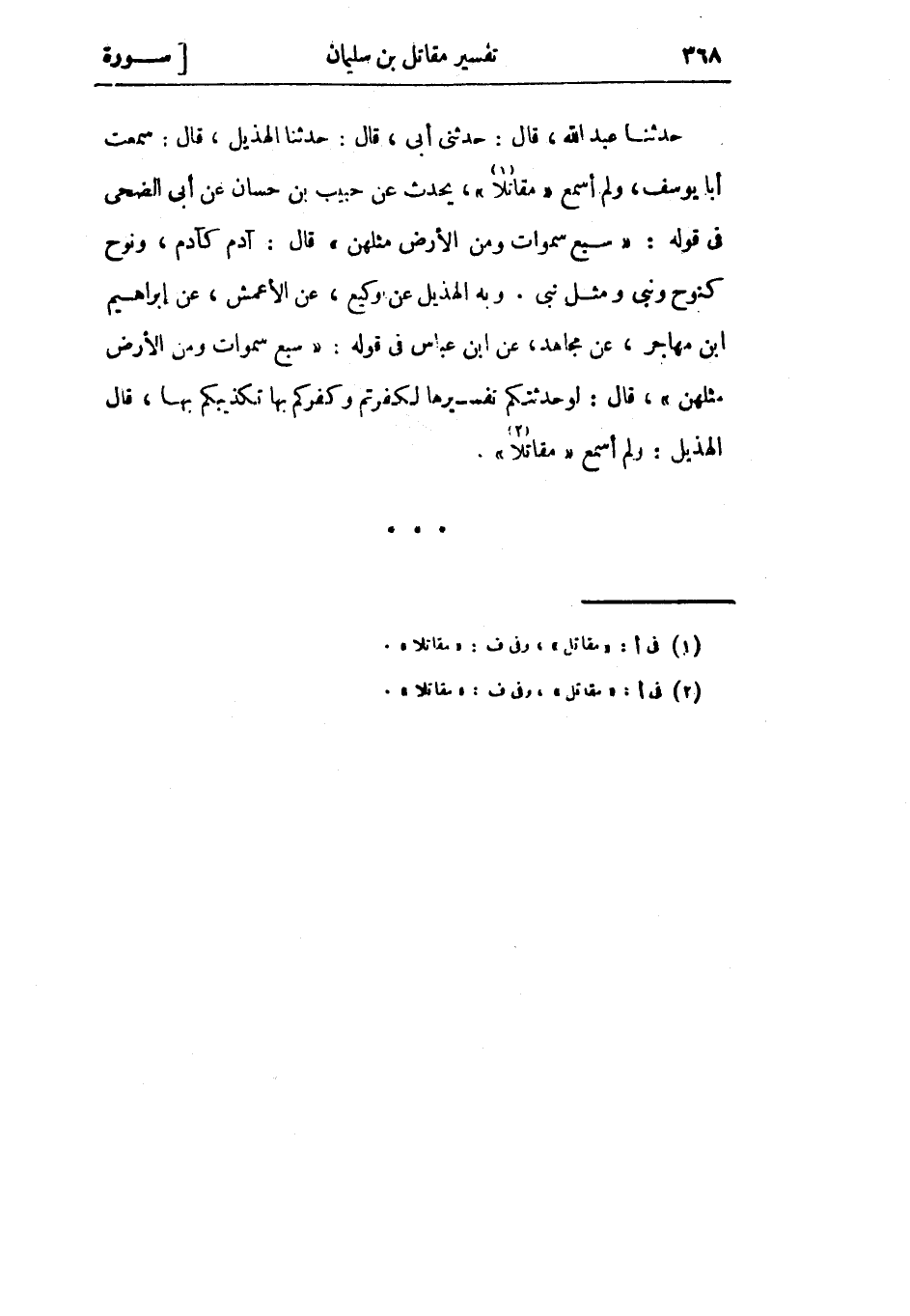 حَدَّثَنَا عَبْدُ اللَّهِ، قَالَ: حَدَّثَنِي أَبِي، قَالَ: حَدَّثَنَا الْهُذَيْلُ، قَالَ: سَمِعْتُ أَبَا يُوسُفَ، وَلَمْ أسمع «مقاتلا «1» » ، يُحَدِّثُ عَنْ حَبِيبِ بْنِ حَسَّانٍ عَنْ أَبِي الضحى فى قوله: «سَبْعَ سَماواتٍ وَمِنَ الْأَرْضِ مِثْلَهُنَّ» قَالَ: آدَمُ كَآدَمَ، وَنُوحٌ كَنُوحٍ وَنَبِيٌّ وَمِثْلُ نَبِيٍّ. وَبِهِ الْهُذَيْلِ عَنْ وَكِيعٍ، عَنِ الأَعْمَشِ، عن إبراهيم ابن مُهَاجِرٍ، عَنْ مُجَاهِدٍ، عَنِ ابْنِ عَبَّاسٍ فِي قوله: «سَبْعَ سَماواتٍ وَمِنَ الْأَرْضِ مِثْلَهُنَّ» ، قَالَ: لَوْ حَدَّثْتُكُمْ تَفْسِيرَهَا لَكَفَرْتُمْ وَكُفْرُكُمْ بِهَا تكذيبكم بها، قال الهذيل: ولم أسمع «مقاتلا «2» » .