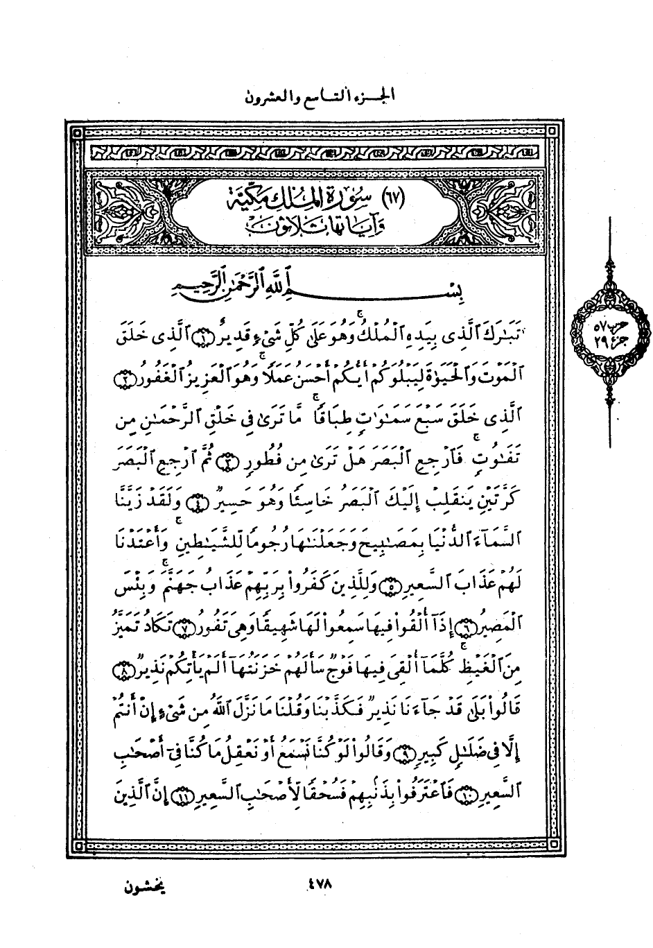 تَبارَكَ الَّذِي بِيَدِهِ الْمُلْكُ وَهُوَ عَلى كُلِّ شَيْءٍ قَدِيرٌ (1) الَّذِي خَلَقَ الْمَوْتَ وَالْحَياةَ لِيَبْلُوَكُمْ أَيُّكُمْ أَحْسَنُ عَمَلاً وَهُوَ الْعَزِيزُ الْغَفُورُ (2) الَّذِي خَلَقَ سَبْعَ سَماواتٍ طِباقاً مَا تَرى فِي خَلْقِ الرَّحْمنِ مِنْ تَفاوُتٍ فَارْجِعِ الْبَصَرَ هَلْ تَرى مِنْ فُطُورٍ (3) ثُمَّ ارْجِعِ الْبَصَرَ كَرَّتَيْنِ يَنْقَلِبْ إِلَيْكَ الْبَصَرُ خاسِئاً وَهُوَ حَسِيرٌ (4)
