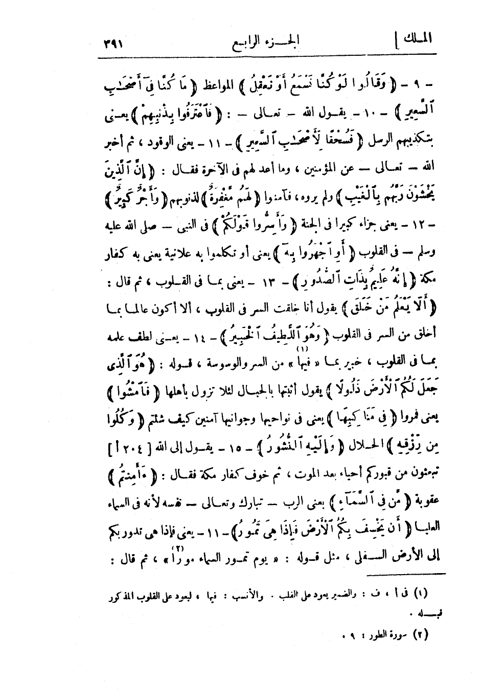 - 9- وَقالُوا لَوْ كُنَّا نَسْمَعُ أَوْ نَعْقِلُ المواعظ ما كُنَّا فِي أَصْحابِ السَّعِيرِ- 10- يقول الله- تعالى-: فَاعْتَرَفُوا بِذَنْبِهِمْ يعني بتكذيبهم الرسل فَسُحْقاً لِأَصْحابِ السَّعِيرِ- 11- يعنى الوقود، ثم أخبر الله- تعالى- عن المؤمنين، وما أعد لهم في الآخرة فقال: إِنَّ الَّذِينَ يَخْشَوْنَ رَبَّهُمْ بِالْغَيْبِ ولم يروه، فآمنوا لَهُمْ مَغْفِرَةٌ لذنوبهم وَأَجْرٌ كَبِيرٌ- 12- يعني جزاء كبيرا في الجنة وَأَسِرُّوا قَوْلَكُمْ في النبي- صلى الله عليه وسلم- فى القلوب أَوِ اجْهَرُوا بِهِ يعني أو تكلموا به علانية يعني به كفار مكة إِنَّهُ عَلِيمٌ بِذاتِ الصُّدُورِ- 13- يعني بما في القلوب، ثم قال: