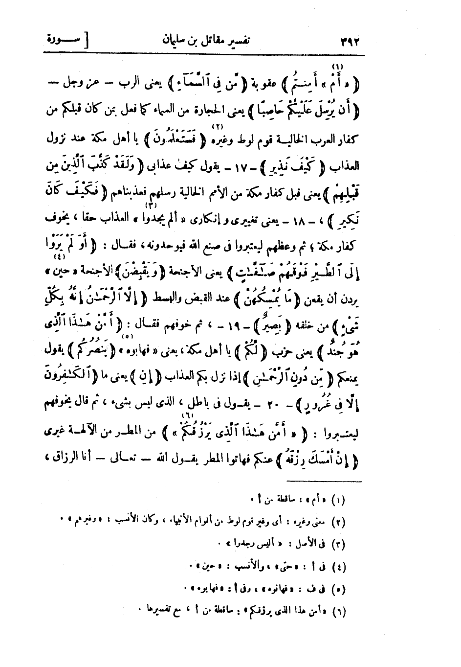 «أَمْ «1» » أَمِنْتُمْ عقوبة مَنْ فِي السَّماءِ يعني الرب- عز وجل- أَنْ يُرْسِلَ عَلَيْكُمْ حاصِباً يعني الحجارة من السماء كما فعل بمن كان قبلكم من كفار العرب الخالية قوم لوط وغيره «2» فَسَتَعْلَمُونَ يا أهل مكة عند نزول العذاب كَيْفَ نَذِيرِ- 17- يقول كيف عذابي وَلَقَدْ كَذَّبَ الَّذِينَ مِنْ قَبْلِهِمْ يعني قبل كفار مكة من الأمم الخالية رسلهم فعذبناهم فَكَيْفَ كانَ نَكِيرِ، - 18- يعني تغييري وإنكاري «ألم يجدوا «3» » العذاب حقا، يخوف كفار مكة، ثم وعظهم ليعتبروا في صنع الله فيوحدونه، فقال: أَوَلَمْ يَرَوْا إِلَى الطَّيْرِ فَوْقَهُمْ صافَّاتٍ يعني الأجنحة وَيَقْبِضْنَ الأجنحة «حين «4» » يردن أن يقعن مَا يُمْسِكُهُنَّ عند القبض والبسط إِلَّا الرَّحْمنُ إِنَّهُ بِكُلِّ شَيْءٍ من خلقه بَصِيرٌ- 19-، ثم خوفهم فقال: أَمَّنْ هذَا الَّذِي هُوَ جُنْدٌ يعنى حزب لَكُمْ يا أهل مكة، يعني «فهابوه «5» » يَنْصُرُكُمْ يقول يمنعكم مِنْ دُونِ الرَّحْمنِ إذا نزل بكم العذاب إِنِ يعني ما الْكافِرُونَ إِلَّا فِي غُرُورٍ- 20- يقول في باطل، الذي ليس بشيء، ثم قال يخوفهم ليعتبروا: «أَمَّنْ هذَا الَّذِي يَرْزُقُكُمْ «6» من المطر من الآلهة غيري إِنْ أَمْسَكَ رِزْقَهُ عنكم فهاتوا المطر يقول الله- تعالى- أنا الرزاق،