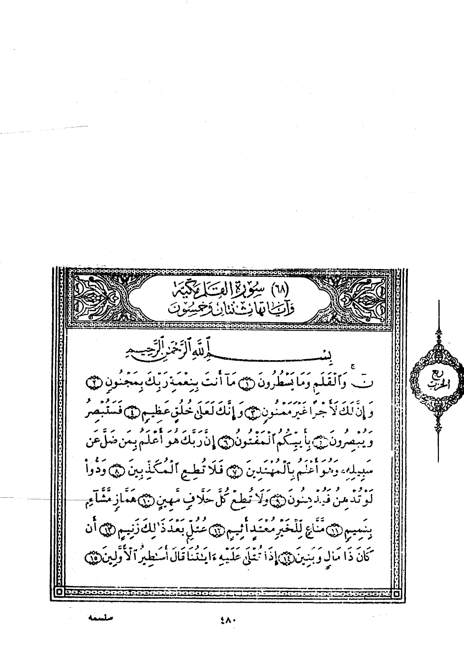 ن وَالْقَلَمِ وَما يَسْطُرُونَ (1) مَا أَنْتَ بِنِعْمَةِ رَبِّكَ بِمَجْنُونٍ (2) وَإِنَّ لَكَ لَأَجْراً غَيْرَ مَمْنُونٍ (3) وَإِنَّكَ لَعَلى خُلُقٍ عَظِيمٍ (4)