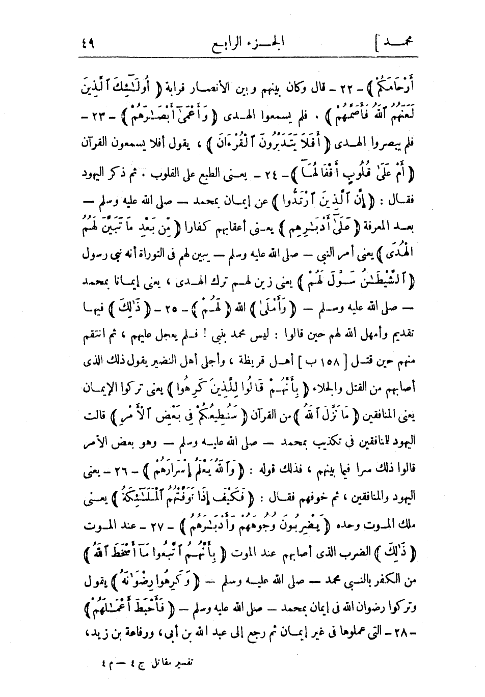 وَتُقَطِّعُوا أَرْحامَكُمْ- 22- قال وكان بينهم وبين الأنصار قرابة أُولئِكَ الَّذِينَ لَعَنَهُمُ اللَّهُ فَأَصَمَّهُمْ. فلم يسمعوا الهدى وَأَعْمى أَبْصارَهُمْ- 23- فلم يبصروا الهدى أَفَلا يَتَدَبَّرُونَ الْقُرْآنَ، يقول أفلا يسمعون القرآن أَمْ عَلى قُلُوبٍ أَقْفالُها- 24- يعنى الطبع على القلوب. ثم ذكر اليهود فقال: إِنَّ الَّذِينَ ارْتَدُّوا عن إيمان بمحمد- صلى الله عليه وسلم- بعد المعرفة عَلى أَدْبارِهِمْ يعني أعقابهم كفارًا مِنْ بَعْدِ ما تَبَيَّنَ لَهُمُ الْهُدَى يعني أمر النبي- صلى الله عليه وسلم- يبين لهم فى التوراة أنه نبى رسول الشَّيْطانُ سَوَّلَ لَهُمْ يعني زين لهم ترك الهدى، يعني إيمانا بمحمد- صَلَّى اللَّهُ عَلَيْهِ وَسَلَّمَ- وَأَمْلى الله لَهُمُ- 25- ذلِكَ فيها تقديم وأمهل الله لهم حين قالوا: ليس محمد بنبي! فلم يعجل عليهم، ثم انتقم منهم حين قتل [158 ب] أهل قريظة، وأجلى أهل النضير يقول ذلك الذي أصابهم من القتل والجلاء بِأَنَّهُمْ قالُوا لِلَّذِينَ كَرِهُوا يعني تركوا الإيمان يعني المنافقين مَا نَزَّلَ اللَّهُ من القرآن سَنُطِيعُكُمْ فِي بَعْضِ الْأَمْرِ قالت اليهود للمنافقين فى تكذيب بمحمد- صلى الله عليه وسلم- وهو بعض الأمر قالوا ذلك سرا فيما بينهم، فذلك قوله: وَاللَّهُ يَعْلَمُ إِسْرارَهُمْ- 26- يعنى اليهود والمنافقين، ثم خوفهم فقال: فَكَيْفَ إِذا تَوَفَّتْهُمُ الْمَلائِكَةُ يعني ملك الموت وحده يَضْرِبُونَ وُجُوهَهُمْ وَأَدْبارَهُمْ- 27- عند الموت ذلِكَ الضرب الذي أصابهم عند الموت بِأَنَّهُمُ اتَّبَعُوا ما أَسْخَطَ اللَّهَ من الكفر بالنبي محمد- صلى الله عليه وسلم- وَكَرِهُوا رِضْوانَهُ يقول وتركوا رضوان الله في إيمان بمحمد- صلى الله عليه وسلم- فَأَحْبَطَ أَعْمالَهُمْ- 28- التي عملوها في غير إيمان ثم رجع إلى عبد الله بن أبي، ورفاعة بن زيد،
