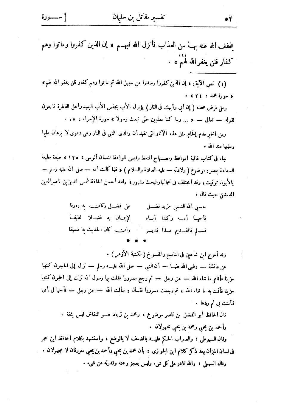 جاء فى كتاب غالية المواعظ ومصباح المتعظ وقبس الواعظ لنعمان آلوسي: 125» طبعة مطبعة السعادة بمصر: موضوع (ولادته- عليه الصلاة والسلام) «فلما كانت أمه- صلى الله عليه وسلم- بالأبواء توفيت، وقد اختلف فى نجاتها والبحث مشهور، ولقد أحسن الحافظ شمس الدين بن ناصر الدين الدمشقي حيث قال: