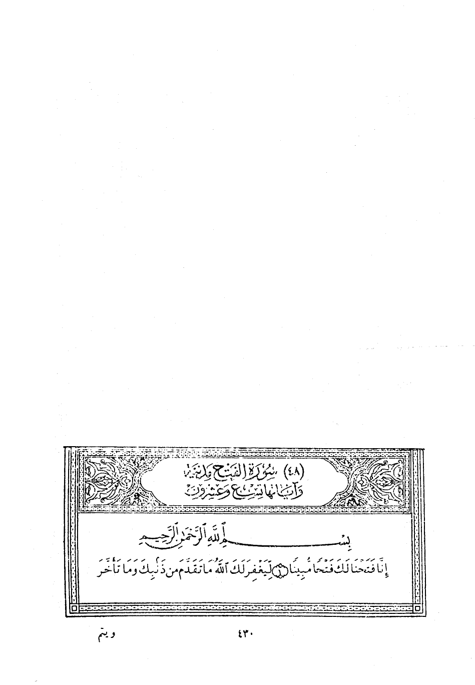 إِنَّا فَتَحْنا لَكَ فَتْحاً مُبِيناً (1) لِيَغْفِرَ لَكَ اللَّهُ مَا تَقَدَّمَ مِنْ ذَنْبِكَ وَما تَأَخَّرَ وَيُتِمَّ نِعْمَتَهُ عَلَيْكَ وَيَهْدِيَكَ صِراطاً مُسْتَقِيماً (2) وَيَنْصُرَكَ اللَّهُ نَصْراً عَزِيزاً (3) هُوَ الَّذِي أَنْزَلَ السَّكِينَةَ فِي قُلُوبِ الْمُؤْمِنِينَ لِيَزْدادُوا إِيماناً مَعَ إِيمانِهِمْ وَلِلَّهِ جُنُودُ السَّماواتِ وَالْأَرْضِ وَكانَ اللَّهُ عَلِيماً حَكِيماً (4)