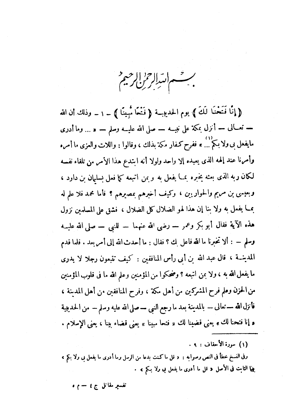 بِسْمِ اللَّهِ الرَّحْمنِ الرَّحِيمِ إِنَّا فَتَحْنا لَكَ يوم الحديبية فَتْحاً مُبِيناً- 1- وذلك أن الله- تعالى- أنزل بمكة على نبيه- صلى الله عليه وسلم- ... وَما أَدْرِي مَا يُفْعَلُ بِي وَلا بِكُمْ ... «1» ففرح كفار مكة بذلك، وقالوا: واللات والعزى ما أمره وأمرنا عند إلهه الذي يعبده إلا واحد ولولا أنه ابتدع هذا الأمر من تلقاء نفسه لكان ربه الذي بعثه يخبره بما يفعل به وبمن اتبعه كما فعل بسليمان بن داود، وبعيسى بن مريم والحواريين، وكيف أخبرهم بمصيرهم؟ فأما محمد فلا علم له بما يفعل به ولا بنا إن هذا لهو الضلال كل الضلال،