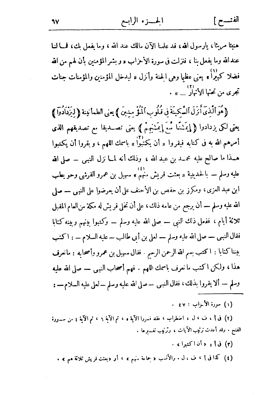 أنه لما نزل النبي- صلى الله عليه وسلم- بالحديبية «بعثت قريش منهم» «4» سهيل بن عمرو القرشي وحويطب ابن عبد العزى، ومكرز بن حفص بن الأحنف على أن يعرضوا على النبي- صلى الله عليه وسلم- أن يرجع من عامه ذلك، على أن تخلي قريش له مكة من العام المقبل ثلاثة أيام، ففعل ذلك النبي- صلى الله عليه وسلم- وكتبوا بينهم وبينه كتابا فقال النبي- صلى الله عليه وسلم- لعلي بن أبي طالب- عليه السلام-: اكتب بيننا كتابا: اكتب بسم الله الرحمن الرحيم. فقال سهيل بن عمرو وأصحابه: ما نعرف هذا، ولكن اكتب ما نعرف باسمك اللهم. فهم أصحاب النبي- صلى الله عليه وسلم- ألا يقروا بذلك، فقال النبي- صلى الله عليه وسلم- لعلى عليه السلام-: