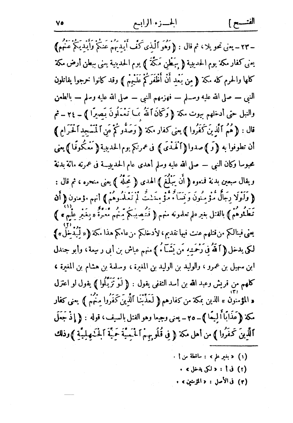 - 23- يعنى تحويلا، ثم قال: وَهُوَ الَّذِي كَفَّ أَيْدِيَهُمْ عَنْكُمْ وَأَيْدِيَكُمْ عَنْهُمْ يعني كفار مكة يوم الحديبية بِبَطْنِ مَكَّةَ يوم الحديبية يعني ببطن أرض مكة كلها والحرم كله مكة مِنْ بَعْدِ أَنْ أَظْفَرَكُمْ عَلَيْهِمْ وقد كانوا خرجوا يقاتلون النبي- صلى الله عليه وسلم- فهزمهم النبي- صلى الله عليه وسلم- بالطعن والنبل حتى أدخلهم بيوت مكة وَكانَ اللَّهُ بِما تَعْمَلُونَ بَصِيراً- 24- ثم قال: هُمُ الَّذِينَ كَفَرُوا يعني كفار مكة وَصَدُّوكُمْ عَنِ الْمَسْجِدِ الْحَرامِ أن تطوفوا به وَصدوا الْهَدْيَ فى عمرتكم يوم الحديبية مَعْكُوفاً يعني محبوسا وكان النبي- صلى الله عليه وسلم أهدى عام الحديبية في عمرته مائة بدنة ويقال سبعين بدنة فمنعوه أَنْ يَبْلُغَ الهدى مَحِلَّهُ يعني منحره، ثم قال: