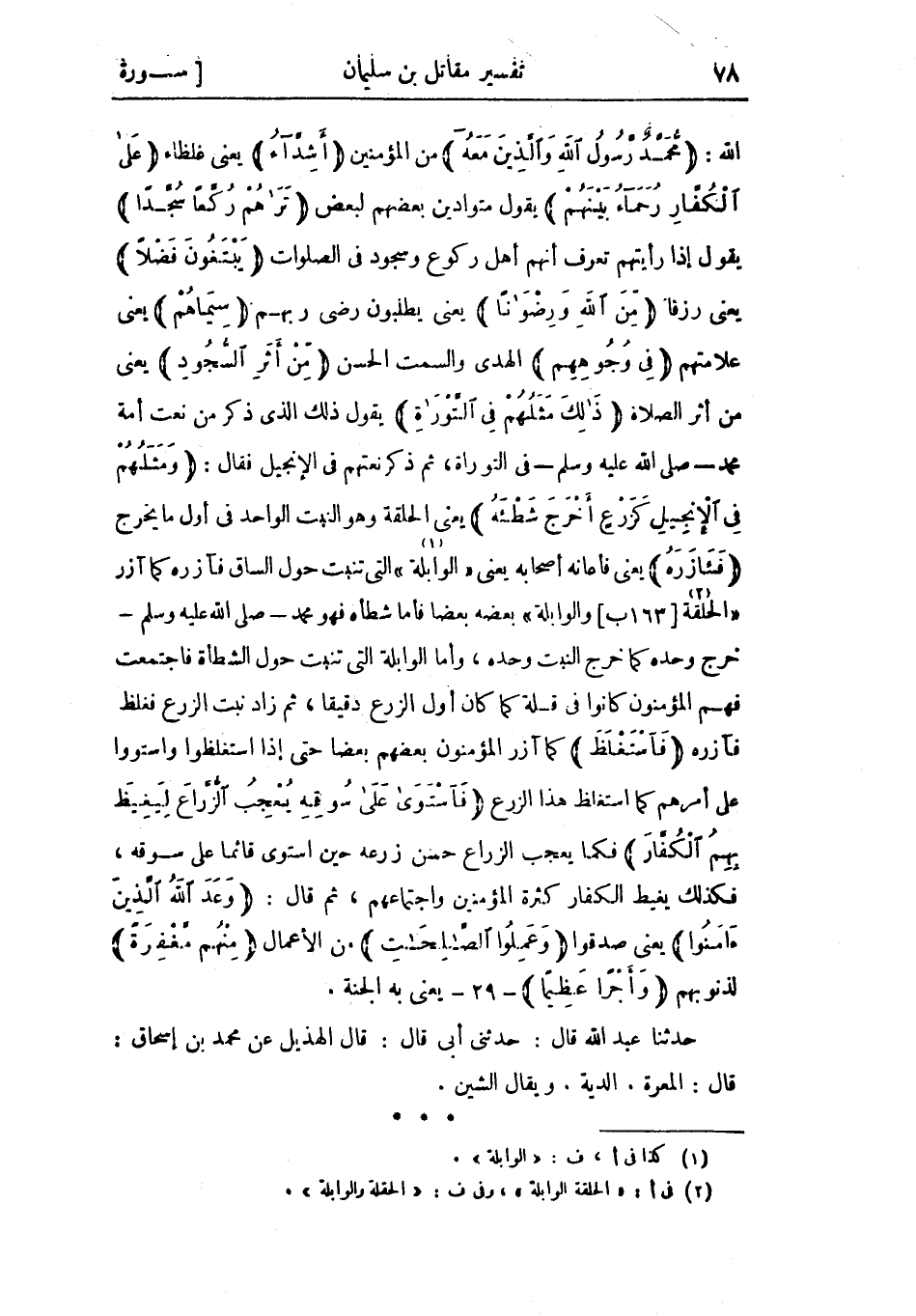 الله: مُحَمَّدٌ رَسُولُ اللَّهِ وَالَّذِينَ مَعَهُ من المؤمنين أَشِدَّاءُ يعني غلظاء عَلَى الْكُفَّارِ رُحَماءُ بَيْنَهُمْ يقول متوادين بعضهم لبعض تَراهُمْ رُكَّعاً سُجَّداً يقول إذا رأيتهم تعرف أنهم أهل ركوع وسجود في الصلوات يَبْتَغُونَ فَضْلًا يعني رزقا مِنَ اللَّهِ وَرِضْواناً يعني يطلبون رضى ربهم سِيماهُمْ يعني علامتهم فِي وُجُوهِهِمْ الهدى والسمت الحسن مِنْ أَثَرِ السُّجُودِ يعني من أثر الصلاة ذلِكَ مَثَلُهُمْ فِي التَّوْراةِ يقول ذلك الذي ذكر من نعت أمة محمد- صَلَّى اللَّهُ عَلَيْهِ وَسَلَّمَ- فِي التوراة، ثم ذكر نعتهم في الإنجيل فقال: وَمَثَلُهُمْ فِي الْإِنْجِيلِ كَزَرْعٍ أَخْرَجَ شَطْأَهُ يعني الحلقة وهو النبت الواحد في أول ما يخرج فَآزَرَهُ يعني فأعانه أصحابه يعني «الوابلة» «1» التي تنبت حول الساق فآزره كما آزر «الحلقة «2» [163 ب] والوابلة» بعضه بعضا فأما شطأه فهو محمد- صلى الله عليه وسلم- خرج وحده كما خرج النبت وحده، وأما الوابلة التي تنبت حول الشطأة فاجتمعت فهم المؤمنون كانوا في قلة كما كان أول الزرع دقيقا، ثم زاد نبت الزرع فغلظ فآزره فَاسْتَغْلَظَ كما آزر المؤمنون بعضهم بعضا حتى إذا استغلظوا واستووا على أمرهم كما استغلظ هذا الزرع فَاسْتَوى عَلى سُوقِهِ يُعْجِبُ الزُّرَّاعَ لِيَغِيظَ بِهِمُ الْكُفَّارَ فكما يعجب الزراع حسن زرعه حين استوى قائما على سوقه، فكذلك يغيظ الكفار كثرة المؤمنين واجتماعهم، ثم قال: وَعَدَ اللَّهُ الَّذِينَ آمَنُوا يعني صدقوا وَعَمِلُوا الصَّالِحاتِ من الأعمال مِنْهُمْ مَغْفِرَةً لذنوبهم وَأَجْراً عَظِيماً- 29- يعني به الجنة.
