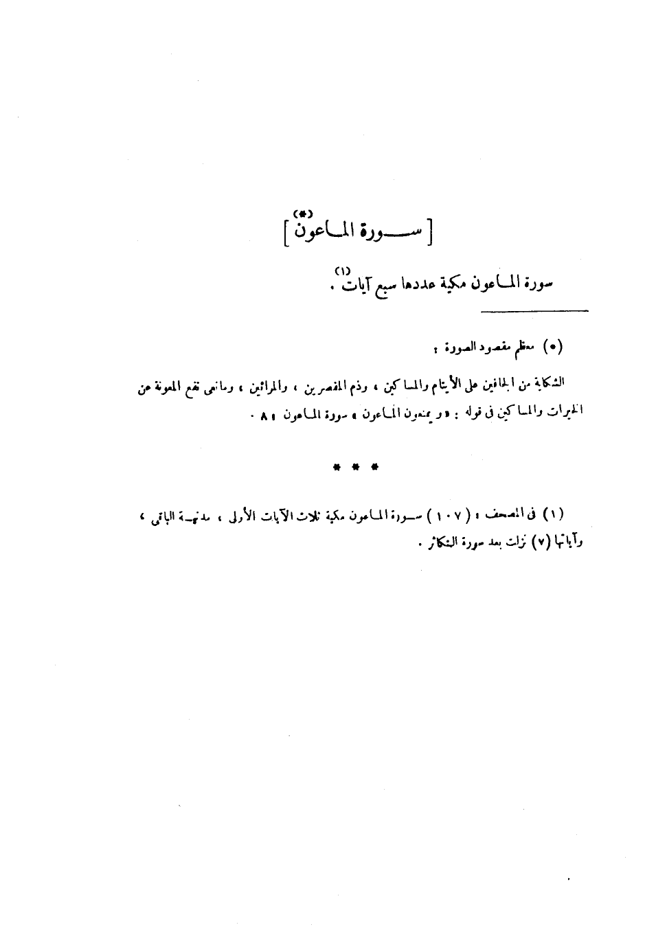 (2) فى المصحف: (107) سورة الماعون مكية ثلاث الآيات الأولى، مدنية الباقي، وآياتها (7) نزلت بعد سورة التكاثر.