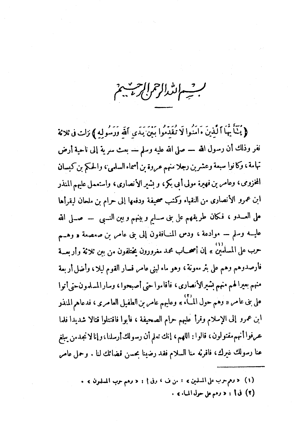 بِسْمِ اللَّهِ الرَّحْمنِ الرَّحِيمِ يا أَيُّهَا الَّذِينَ آمَنُوا لا تُقَدِّمُوا بَيْنَ يَدَيِ اللَّهِ وَرَسُولِهِ نزلت في ثلاثة نفر وذلك أن رسول الله- صلى الله عليه وسلم- بعث سرية إلى ناحية أرض تهامة، وكانوا سبعة وعشرين رجلا منهم عروة بن أسماء السلمي، والحكم بن كيسان المخزومي، وعامر بن فهيرة مولى أبي بكر، وبشير الأنصاري، واستعمل عليهم المنذر ابن عمرو الأنصاري من النقباء وكتب صحيفة ودفعها إلى حرام بن ملحان ليقرأها على العدو، فكان طريقهم على بني سليم وبينهم وبَيْنَ النَّبِيّ- صَلَّى اللَّهُ عَلَيْهِ وَسَلَّمَ- موادعة، ودس المنافقون إلى بني عامر بن صعصعة «وهم حرب على المسلمين «1» » إن أصحاب محمد مغرورون يختلفون من بين ثلاثة وأربعة فأرصدوهم وهم على بئر معوتة، وهو ماء لبني عامر فسار القوم ليلا، وأضل أربعة منهم بعيرا لهم منهم بشير الأنصاري، فأقاموا حتى أصبحوا، وسار المسلمون حتى أتوا على بني عامر «وهم حول الماء» «2» وعليهم عامر بن الطفيل العامري، فدعاهم المنذر ابن عمرو إلى الإسلام وقرأ عليهم حرام الصحيفة، فأبوا فاقتتلوا قتالا شديدا فلما عرفوا أنهم مقتولون، قالوا: اللهم، إنك تعلم أن رسولك أرسلنا، وإنا لا نجد من يبلغ عنا رسولك غيرك، فأقرءه منا السلام فقد رضينا بحسن قضائك لنا. وحمل عامر