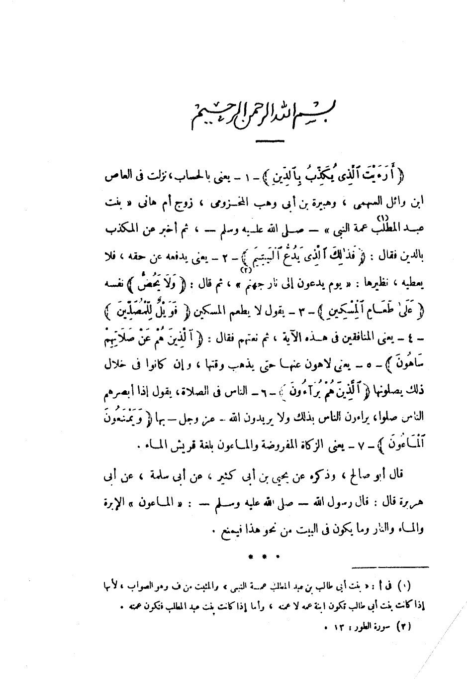 بِسْمِ اللَّهِ الرَّحْمنِ الرَّحِيمِ أَرَأَيْتَ الَّذِي يُكَذِّبُ بِالدِّينِ- 1- يعنى بالحساب، نزلت فى العاص ابن وائل السهمي، وهبيرة بن أبي وهب المخزومي، زوج أم هاني «بنت عبد المطلب «1» عمة النبي» - صلى الله عليه وسلم- ثم أخبر عن المكذب بالدين فقال: فَذلِكَ الَّذِي يَدُعُّ الْيَتِيمَ- 2- يعني يدفعه عن حقه، فلا يعطيه، نظيرها: «يَوْمَ يُدَعُّونَ إِلى نارِ جَهَنَّمَ «2» » ، ثم قال: وَلا يَحُضُّ نفسه عَلى طَعامِ الْمِسْكِينِ- 3- يقول لا يطعم المسكين فَوَيْلٌ لِلْمُصَلِّينَ- 4- يعني المنافقين في هذه الآية، ثم نعتهم فقال: الَّذِينَ هُمْ عَنْ صَلاتِهِمْ ساهُونَ- 5- يعني لاهون عنها حتى يذهب وقتها، وإن كانوا في خلال ذلك يصلونها الَّذِينَ هُمْ يُراؤُنَ- 6- الناس في الصلاة، يقول إذا أبصرهم الناس صلوا، يراءون الناس بذلك ولا يريدون الله- عز وجل- بها وَيَمْنَعُونَ الْماعُونَ- 7- يعني الزكاة المفروضة والماعون بلغة قريش الماء.