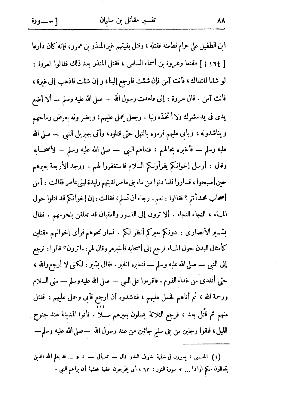 قال عروة: إني عاهدت رسول الله- صلى الله عليه وسلم- ألا أضع يدي في يد مشرك ولا أتخذه وليا. وجعل يحمل عليهم، ويضربونه بعرض رماحهم ويناشدونه، ويأبى عليهم فرموه بالنبل حتى قتلوه، وأتى جبريل النبي- صلى الله عليه وسلم- فأخبره بحالهم، فنعاهم النبي- صلى الله عليه وسلم- لأصحابه وقال: أرسل إخوانكم يقرءونكم السلام فاستغفروا لهم. ووجد الأربعة بعيرهم حين أصبحوا، فساروا فلما دنوا من ماء بني عامر لقيتهم وليدة لبني عامر فقالت: أمن أصحاب محمد أنتم؟ فقالوا: نعم، رجاء أن تسلم، فقالت: إن إخوانكم قد قتلوا حول الماء، النجاء النجاء. ألا ترون إلى النسور والعقبان قد تعلقن بلحومهم. فقال بشير الأنصاري: دونكم بعيركم أنظر لكم. فسار نحوهم فرأى إخوانهم مقتلين كأمثال البدن حول الماء فرجع إلى أصحابه فأخبرهم وقال لهم: ما ترون؟ قالوا: نرجع إلى النبي- صلى الله عليه وسلم- فنخبره الخبر. فقال بشير: لكني لا أرجع والله، حتى أتغدى من غداء القوم. فاقرءوا على النبي- صلى الله عليه وسلم- مني السلام ورحمة الله، ثم أتاهم فحمل عليهم، فناشدوه أن ارجع فأبى وحمل عليهم، فقتل منهم ثم قُتِلَ بعد، فرجع الثلاثة يسلون بعيرهم سلا «1» . فأتوا المدينة عند جنوح الليل، فلقوا رجلين من بني سليم جائين من عند رسول الله- صلّى الله عليه وسلم-