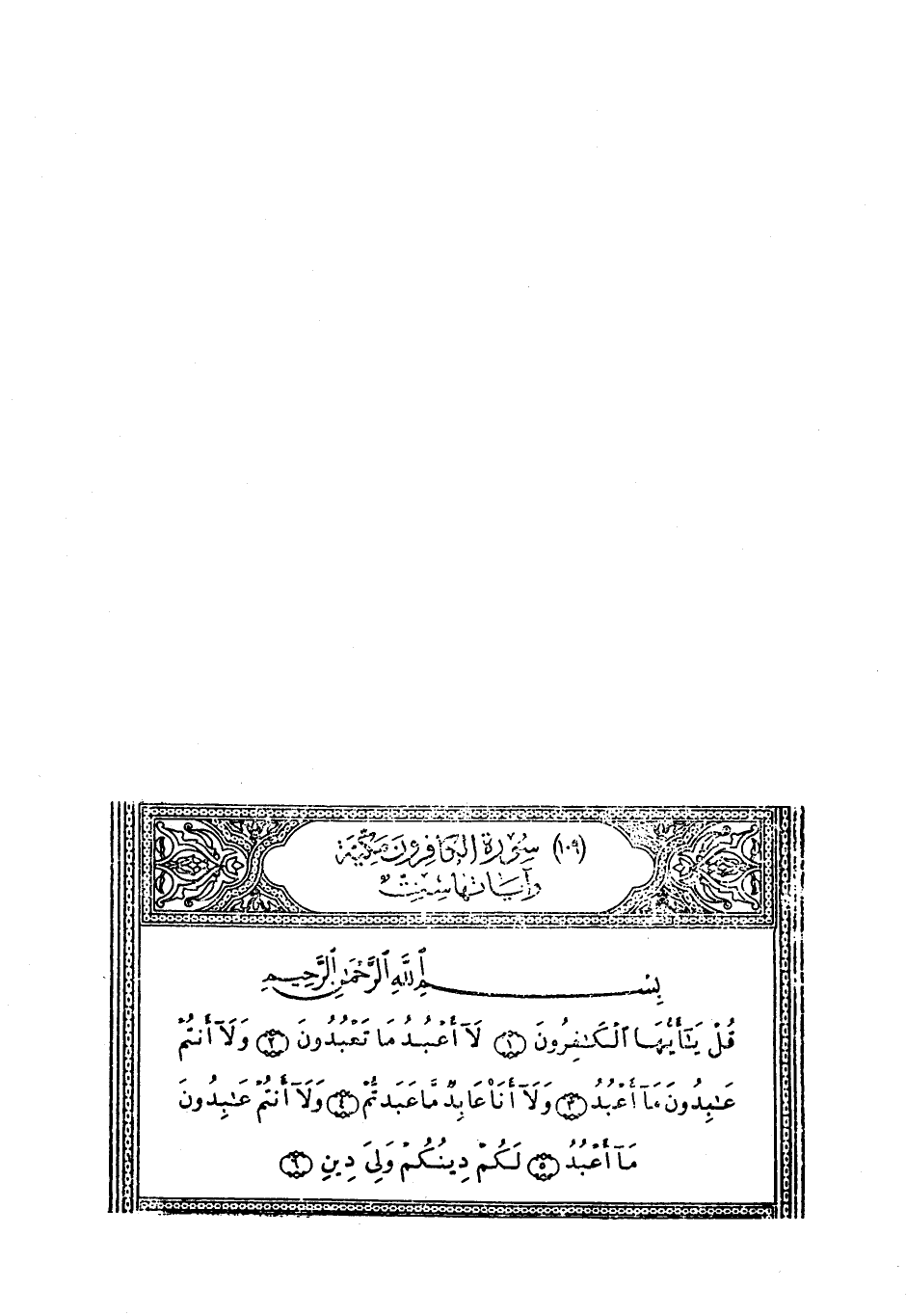 قُلْ يا أَيُّهَا الْكافِرُونَ (1) لا أَعْبُدُ مَا تَعْبُدُونَ (2) وَلا أَنْتُمْ عابِدُونَ مَا أَعْبُدُ (3) وَلا أَنا عابِدٌ مَا عَبَدْتُّمْ (4)