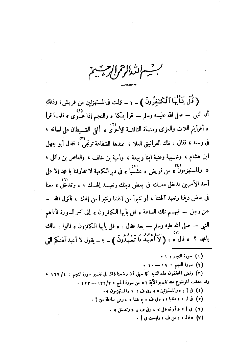 بِسْمِ اللَّهِ الرَّحْمنِ الرَّحِيمِ قُلْ يا أَيُّهَا الْكافِرُونَ- 1- نزلت في المستهزئين من قريش، وذلك