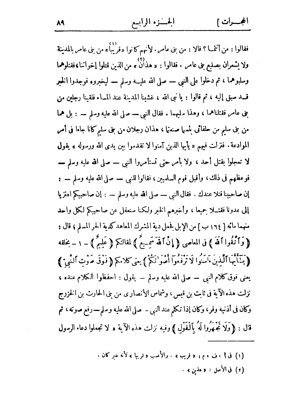 فقالوا: من أنتما؟ قالا: من بني عامر. لأنهم كانوا «قريبا» «1» من بني عامر بالمدينة ولا يشعران بصنيع بنى عامر. فقالوا: «هذان» «2» من الذين قاتلوا إخواننا، فقتلوهما وسلبوهما، ثم دخلوا عَلَى النَّبِيّ- صَلَّى اللَّهُ عَلَيْهِ وَسَلَّمَ- ليخبروه فوجدوا الخبر قد سبق إليه، ثم قالوا: يا نبي الله، غشينا المدينة عند المساء فلقينا رجلين من بني عامر فقتلناهما، وهذا سلبهما. فقال النبي- صلى الله عليه وسلم-: بل هما من بني سليم من حلفائي بئسما صنعتما، هذان رجلان من بني سليم كانا جاءا في أمر الموادعة. فنزلت فيهم «يا أَيُّهَا الَّذِينَ آمَنُوا لا تُقَدِّمُوا بَيْنَ يَدَيِ اللَّهِ وَرَسُولِهِ» يقول لا تعجلوا بقتل أحد، ولا بأمر حتى تستأمروا النبي- صلى الله عليه وسلم- فوعظهم في ذلك، وأقبل قوم السلميين، فقالوا للنبي- صَلَّى اللَّهُ عَلَيْهِ وَسَلَّمَ-: